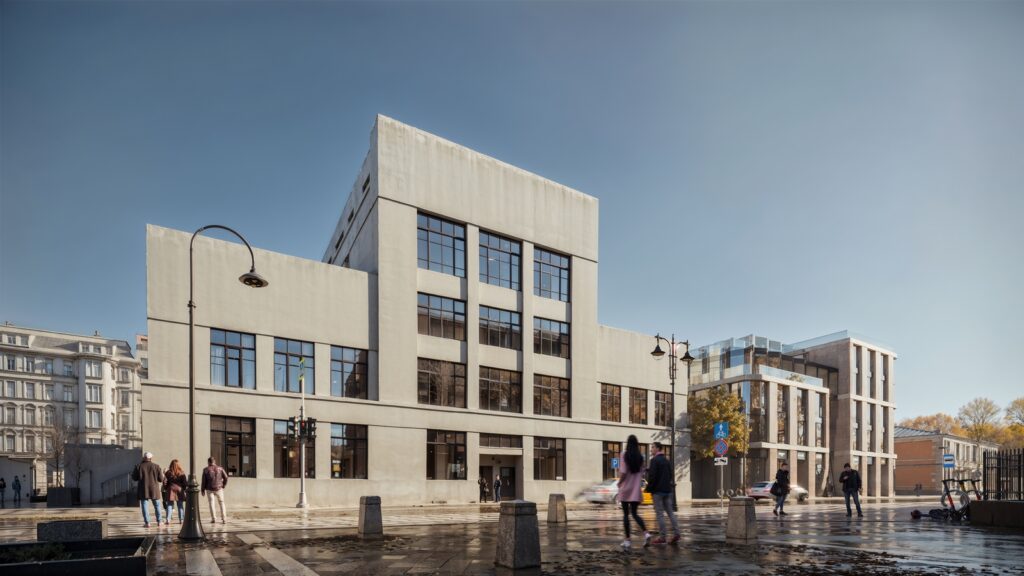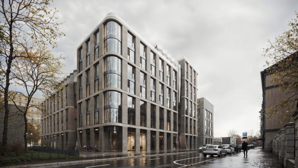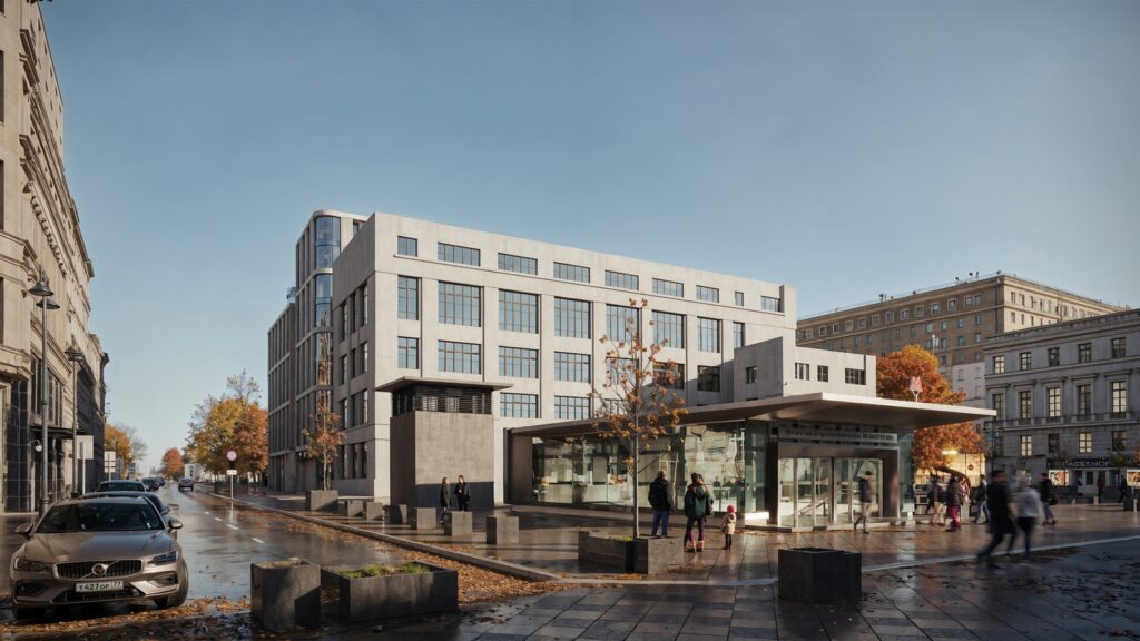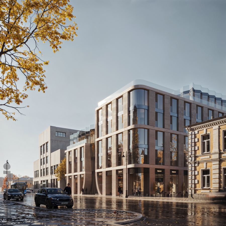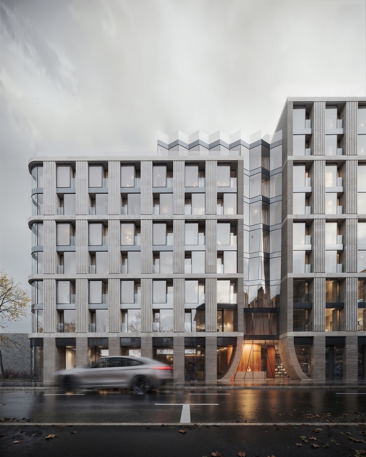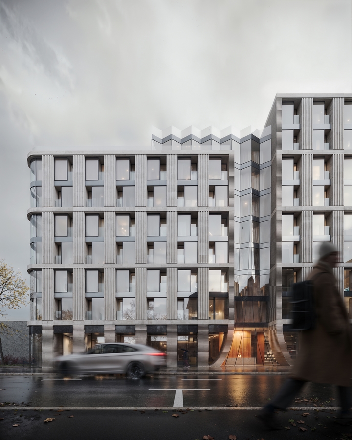 The residential complex is planned to be built between Bolshaya and Malaya Ordynka streets right next to the Tretyakovskaya metro station exit. A recently identified cultural heritage building is located on the site: the first Soviet automatic telephone exchange building built in 1930 by the architect V. Patek. Constructed in the constructivist style from monolithic reinforced concrete structures, the building is a characteristic monument of its time, which the architects by all means sought to preserve. The new residential volume is located behind and slightly setback from the telephone exchange building, making it possible to arrange a cozy courtyard between them. Borisov Architects designed the new building with a stepped silhouette, gradually descending (from 9 to 4 floors) going from Malaya to Bolshaya Ordynka Street, in this way harmonizing the buildings from different eras with each other and helping to integrate the 21st century volume into the existing historical context of the area as delicately as possible. This task was also given to the architectural design of the complex’s facades, where the authors used a balanced mix of classical proportions and modern techniques in plasticity. The strong rhythm of the facades, clearly echoing the rhythm of the neighboring constructivist building, is created by wide vertical pylons, while both the rounded corners of the building volume itself as well as the pylons flanking the entrances to the complex help to avoid the common monotony of such a design. The pylons themselves are additionally accented with multidirectional corrugation, emphasizing the straightforward massiveness and texture of the natural stone that was chosen for the facade cladding. In contrast to this pronouncedly tactile cladding, the walls of the upper levels, which retreat from the site boundaries, are made entirely of glass that the architects have assembled into elegant folds. The first floors of the complex are planned to be allocated for public and commercial functions and parking will be located on two underground levels.