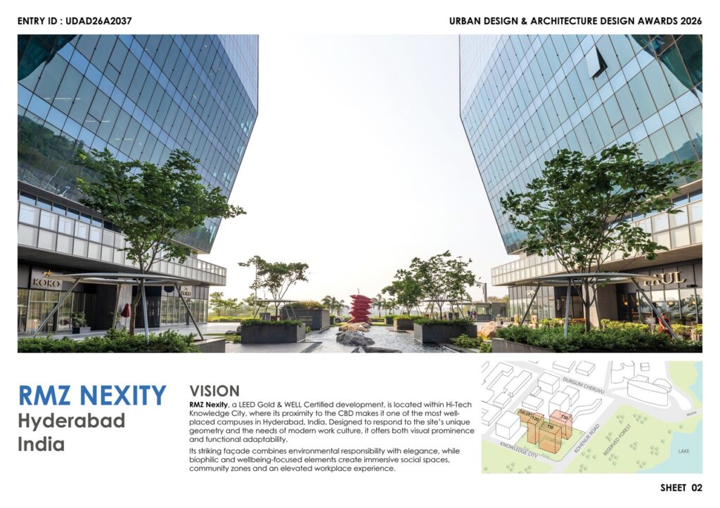 RMZ Nexity, a LEED Gold and WELL Certified development, is located within Hi-Tech Knowledge City, where its proximity to the Central Business District makes it one of the most well-placed campuses in Hyderabad, India. Intended as an iconic landmark within the city’s skyline, three 22-storey high-rise towers were conceptualised in response to its site and emerging business trends.