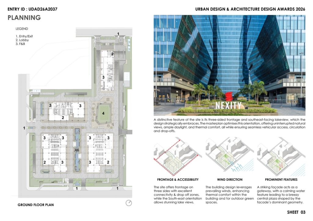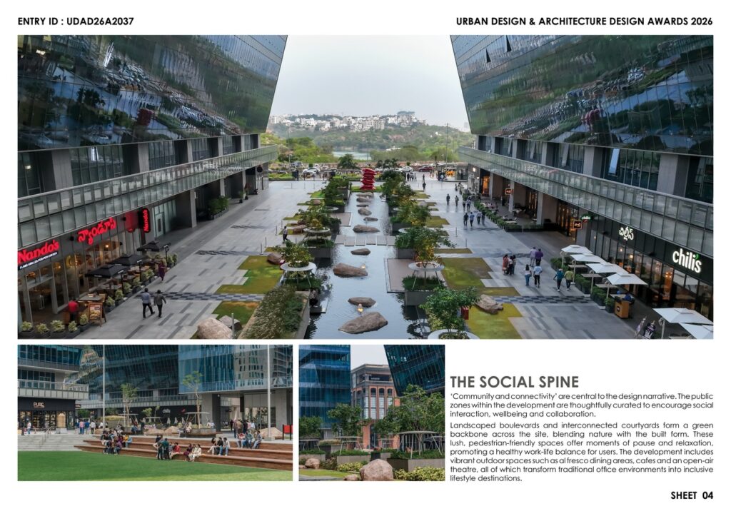 To encourage social interactions, al-fresco dining and open-air theatre add vibrancy and help transform workplace culture. Simultaneously, biophilic elements like water features, designed for evaporative cooling, and sculptured gardens set within its gateway-shaped striking façade enhance the arrival experience, elevating the development’s identity. The building design leverages prevailing winds for natural ventilation, enhancing thermal comfort indoors and outdoors.