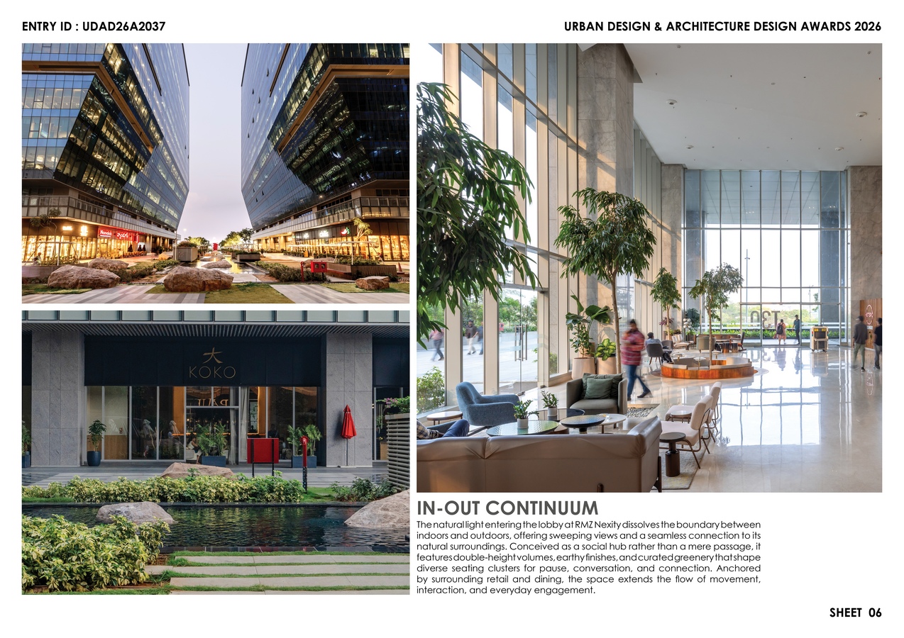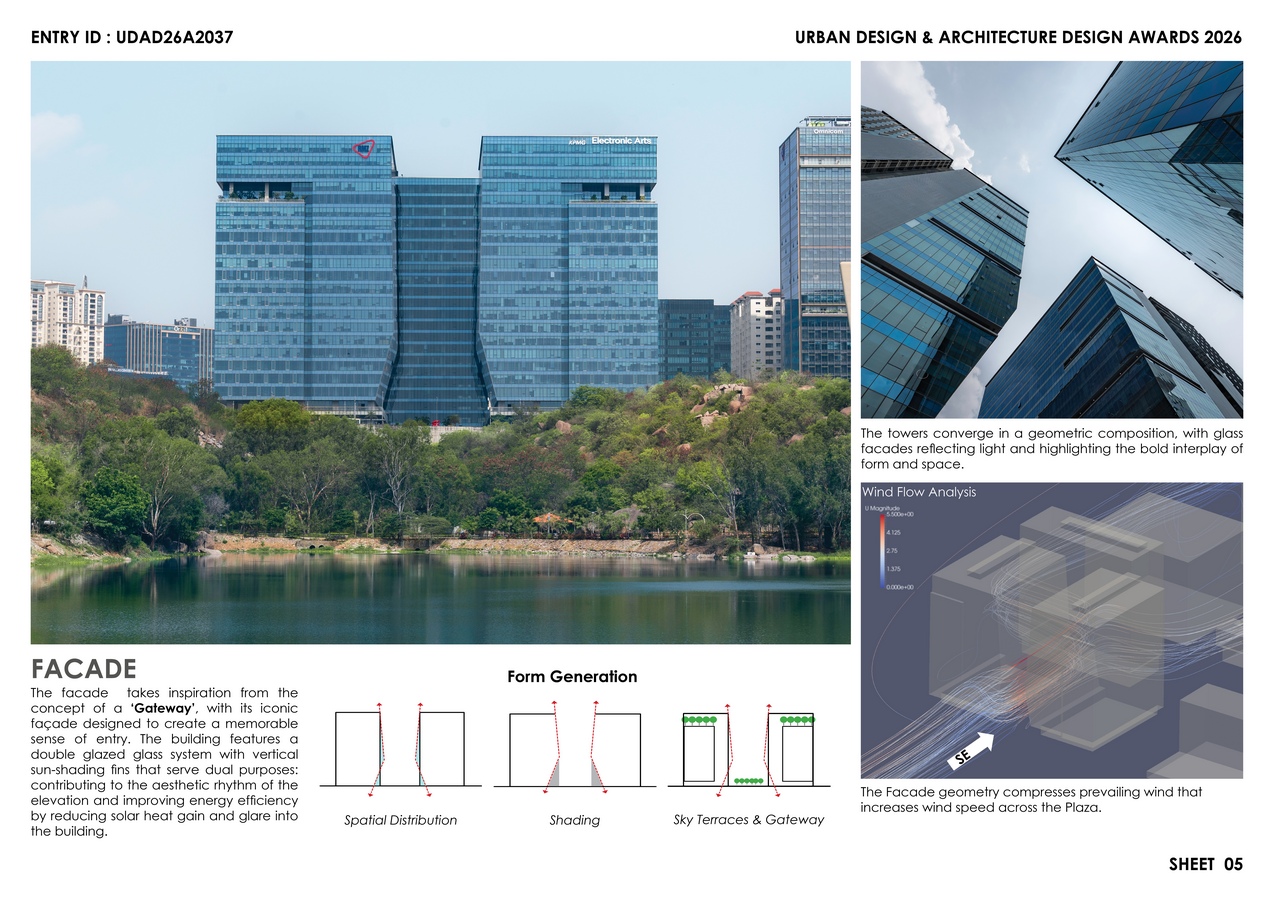 To encourage social interactions, al-fresco dining and open-air theatre add vibrancy and help transform workplace culture. Simultaneously, biophilic elements like water features, designed for evaporative cooling, and sculptured gardens set within its gateway-shaped striking façade enhance the arrival experience, elevating the development’s identity. The building design leverages prevailing winds for natural ventilation, enhancing thermal comfort indoors and outdoors.