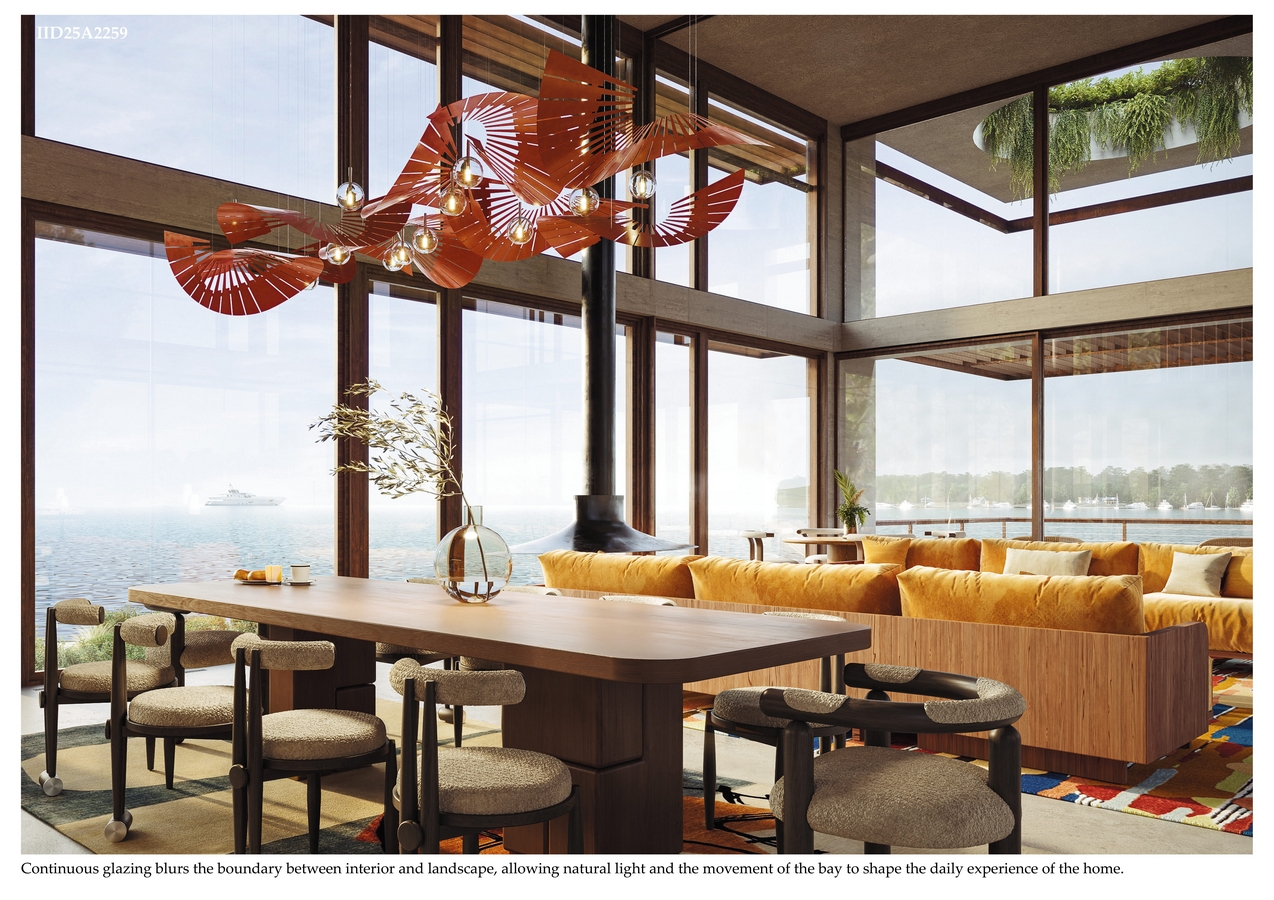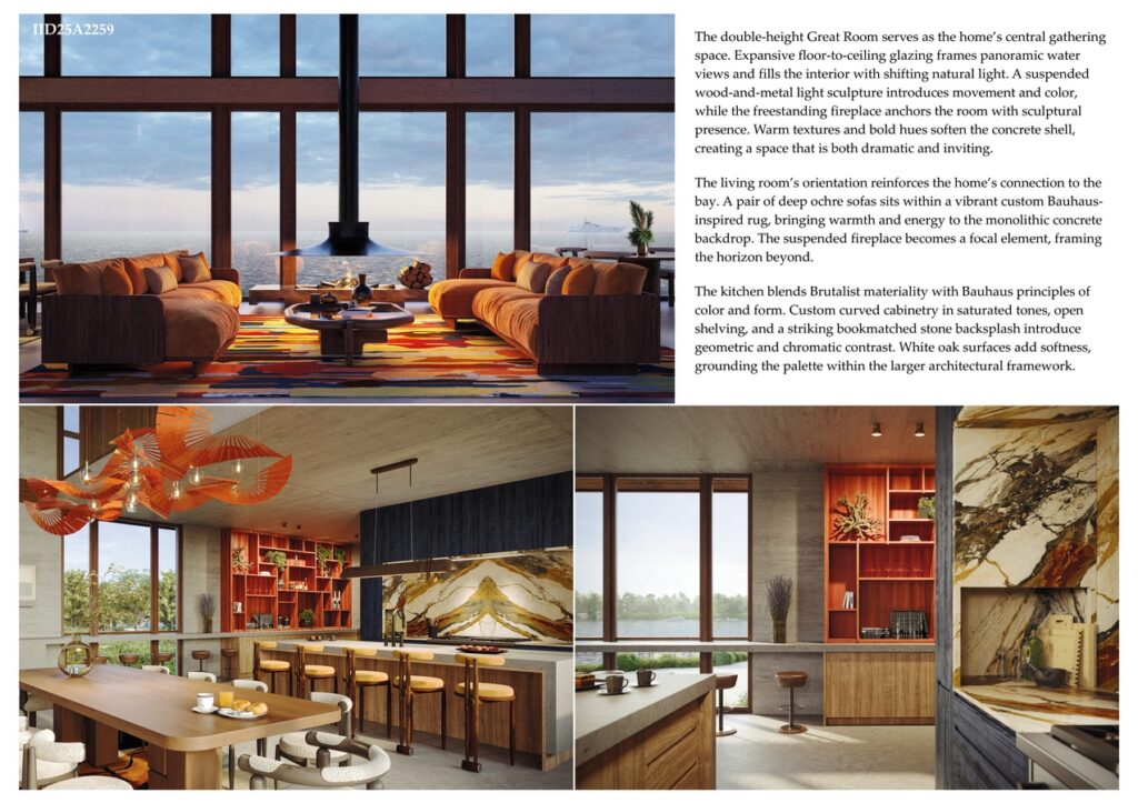 Soft-textured furnishings in velvet and boucle introduce comfort, tactility, and acoustic balance. The clean-lined silhouettes of the furnishings and custom lighting reinforce the geometric precision shared by both Brutalist and Bauhaus philosophies. Strategic placement of these pieces creates zones for rest, gathering, and contemplation of the sweeping 180-degree waterfront views.