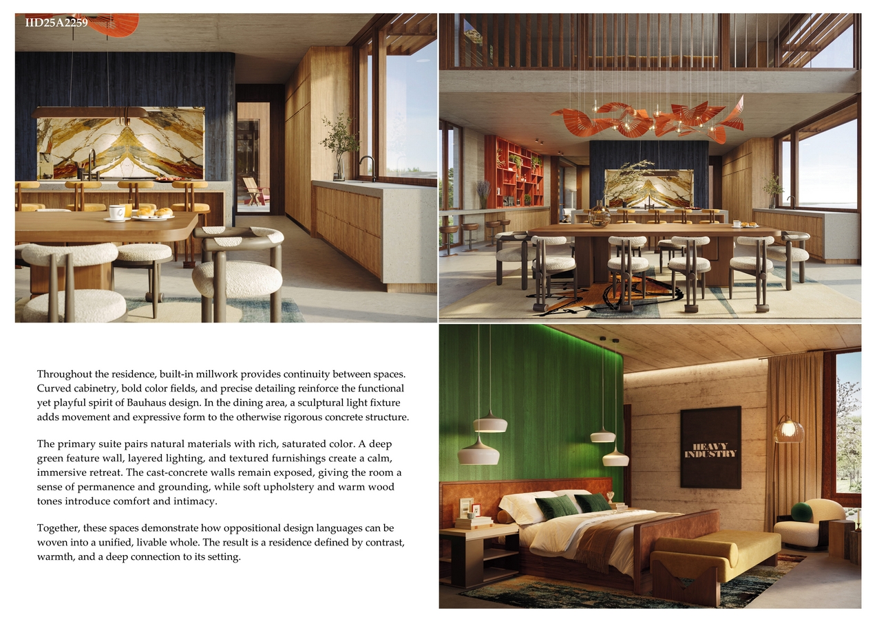 This residential commission called for an unexpected and compelling contradiction: to merge the austere materiality and sculptural weight of Brutalist architecture with the vibrant functionalism of Bauhaus interior design. While Brutalism champions monolithic form and raw, exposed structure, Bauhaus celebrates color, optimized geometry, and human-scaled functionality. Rather than softening or diminishing either style, our goal was to leverage their opposing characteristics to create a new interior vocabulary.