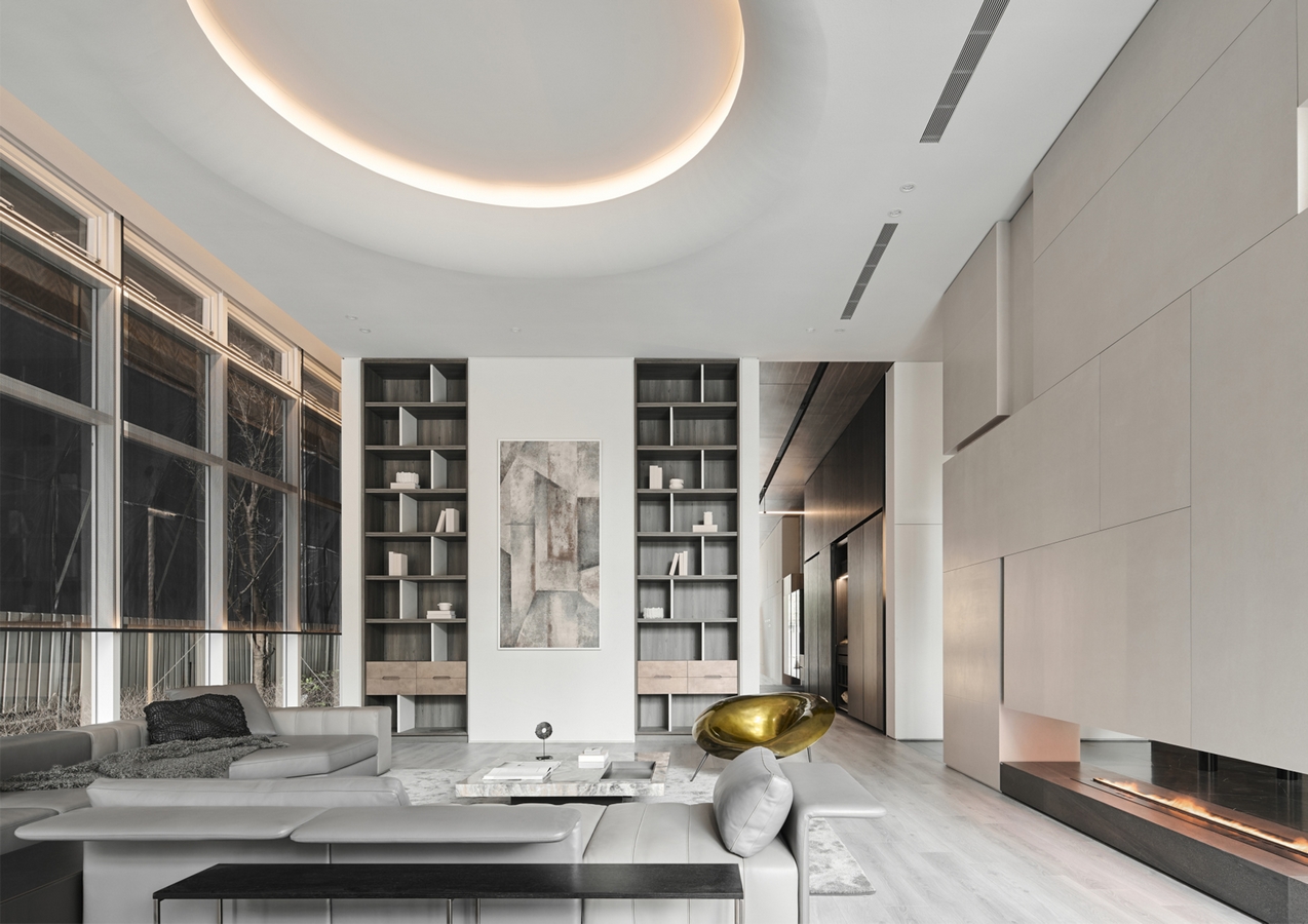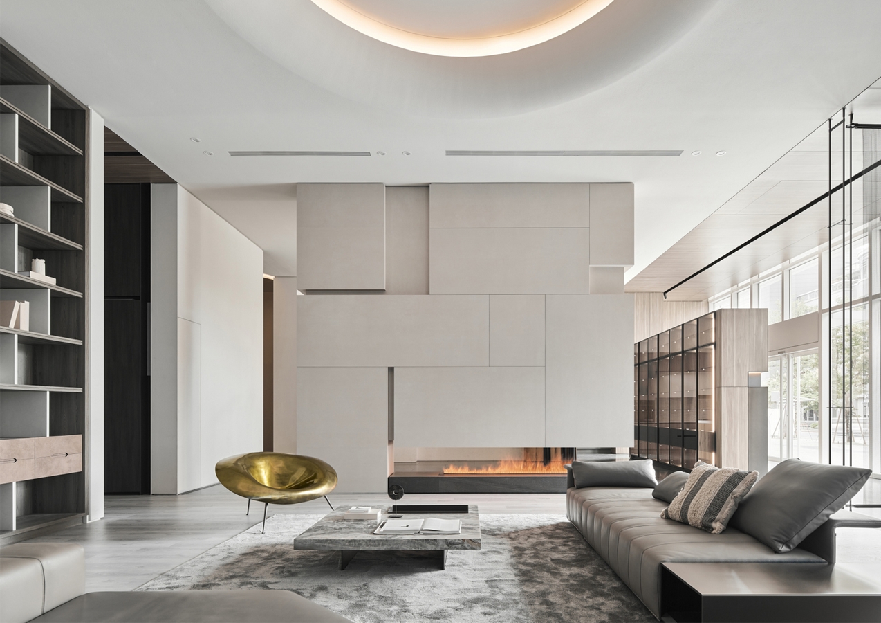 Type A adopts a circular circulation around a geometric TV wall, linking the living and dining areas with translucent partitions of metal screens and grilles.