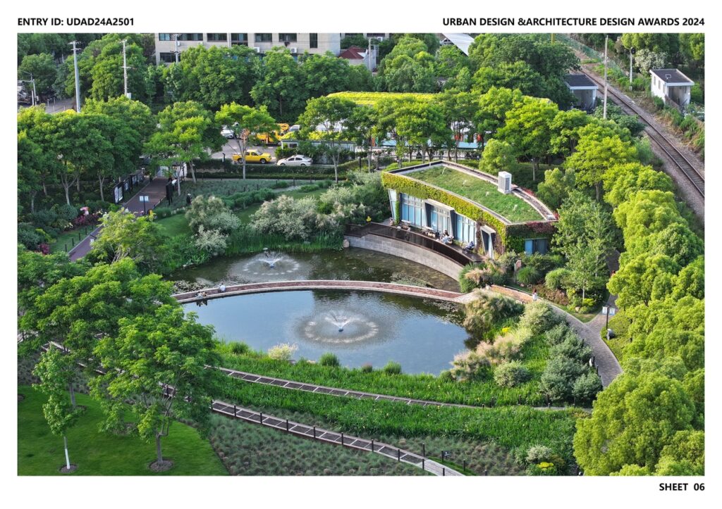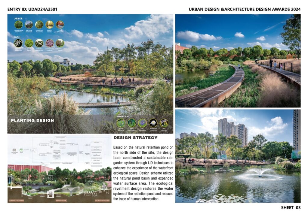 The design team constructed a sustainable rain garden system through LID techniques to enhance the experience of the waterfront ecological space. The design scheme utilized the natural pond basin and expanded the water surface area. The ecological revetment design restores the water system of the retention pond and reduced the trace of human intervention. Considering the topography of the piled-up earthwork excavated for water surface expansion and the revetment design, a sunken rain garden was created on the south side according to the terrain. With aquatic and wetland plants, the rain garden filtrates and stores rainwater collected from the surrounding area, effectively purified and retained rainwater. Through sophisticated planting design and innovative vertical planting, tremendous ground buildings of substation and facilities are hidden among planting.