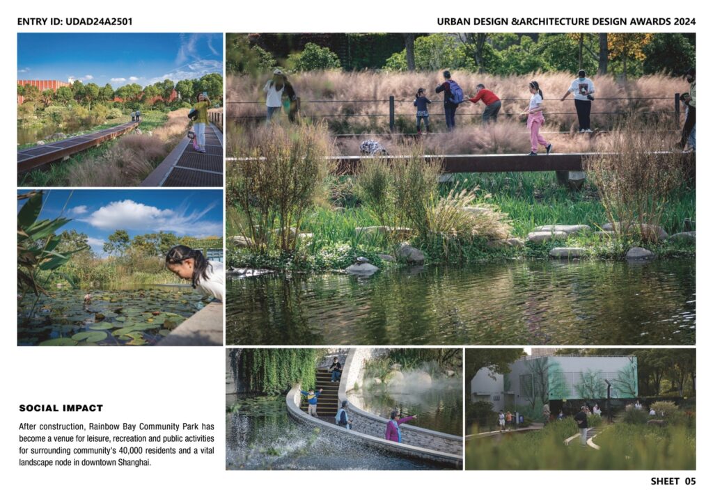 After construction, Rainbow Bay Community Park has become a venue for leisure, recreation and public activities for the surrounding community’s 40,000 residents and a vital landscape node in downtown Shanghai. The project integrates multiple functions including ecological regulation, ecological protection, isolation, rainwater collection, popular science demonstration, public services, leisure, and sightseeing. Rainbow Bay Community Park allows the former industrial brownfield to be reborn and keep growing with a new mission.