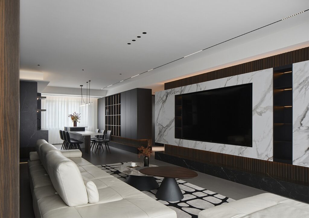 The first visual impression of this case is a sense of spaciousness. The comfort of the space is maximally utilized. The open – style kitchen is connected to the dining room and the living – room’s open – plan hall, elongating the sense of extension and increasing the sense of space. There are large floor – to – ceiling windows, with translucent white gauze curtains paired with cream – colored blackout curtains. When opened, one can enjoy the beautiful scenery outside the window, and when closed, one can rest comfortably. The entire TV background wall is made of spliced white rock slabs, with an embedded TV wall design. Open grids are made beside it to store ornaments, and there is a suspended platform design. The overall shape is simple, making the entire space cleaner and tidier. The entire color system echoes the TV background wall. The invisible door with zero sense of presence makes the space clean, transparent, and the visual effect is excellent! Use the simplest lines to create a spatial atmosphere that is empty yet beautiful.