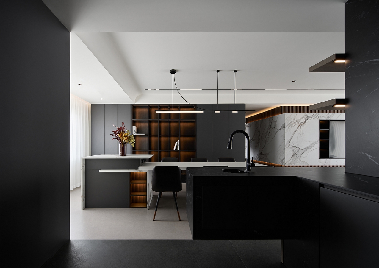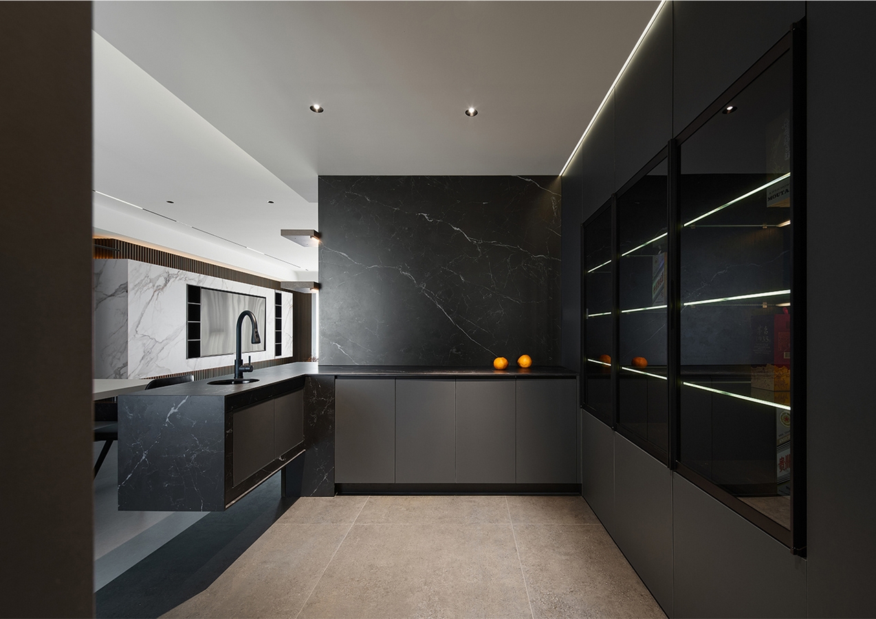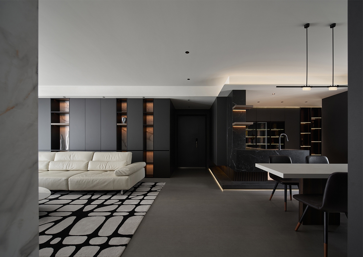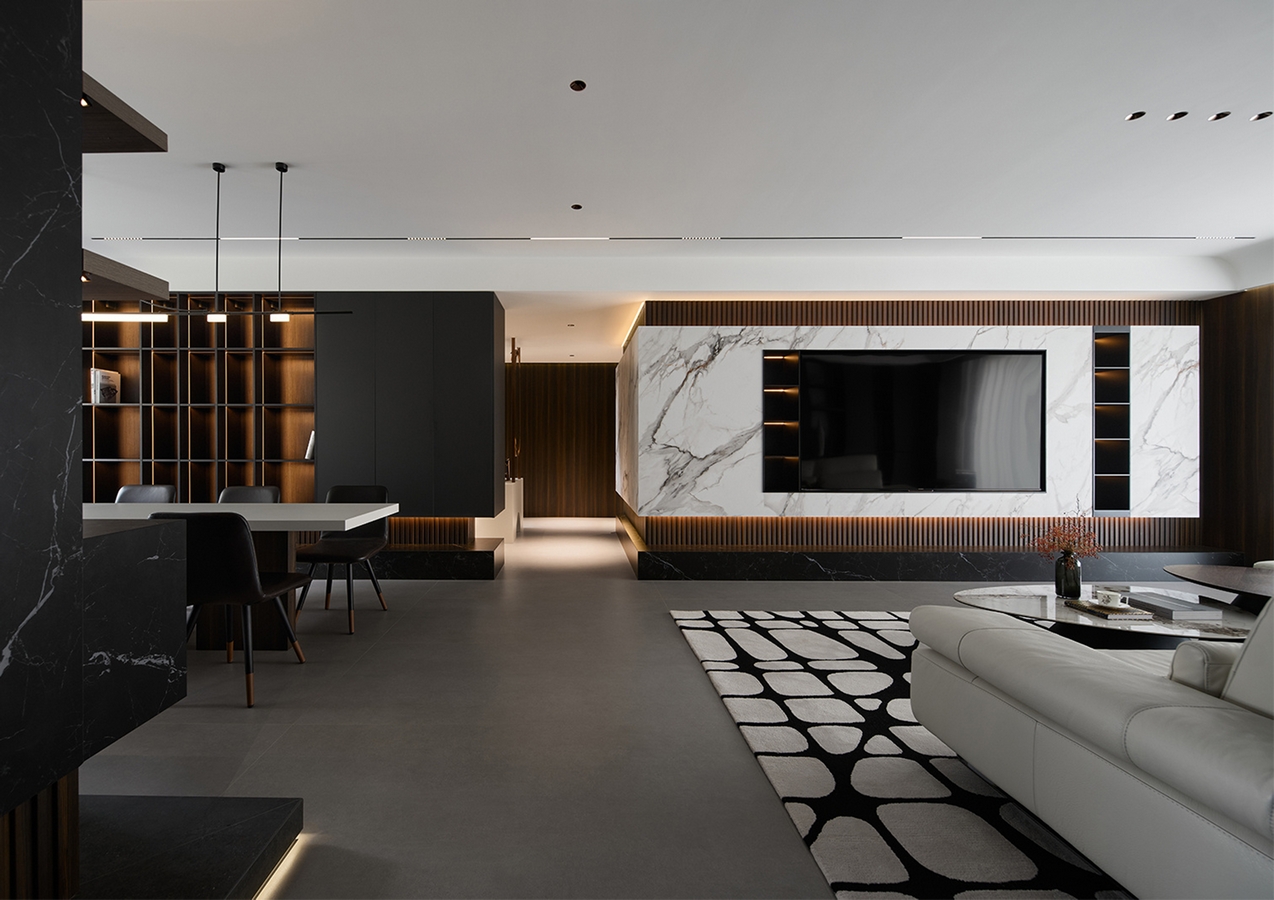 The first visual impression of this case is a sense of spaciousness. The comfort of the space is maximally utilized. The open – style kitchen is connected to the dining room and the living – room’s open – plan hall, elongating the sense of extension and increasing the sense of space. There are large floor – to – ceiling windows, with translucent white gauze curtains paired with cream – colored blackout curtains. When opened, one can enjoy the beautiful scenery outside the window, and when closed, one can rest comfortably. The entire TV background wall is made of spliced white rock slabs, with an embedded TV wall design. Open grids are made beside it to store ornaments, and there is a suspended platform design. The overall shape is simple, making the entire space cleaner and tidier. The entire color system echoes the TV background wall. The invisible door with zero sense of presence makes the space clean, transparent, and the visual effect is excellent! Use the simplest lines to create a spatial atmosphere that is empty yet beautiful.