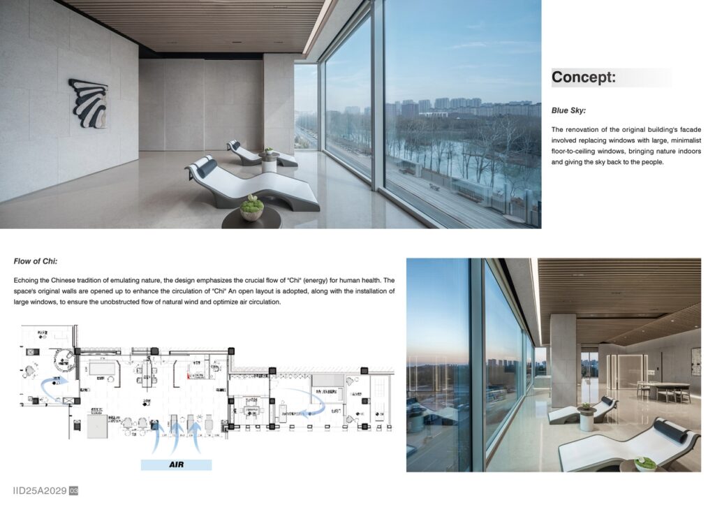 Transforming the top-floor open space into a wellness SPA provides an escape from urban noise and achieves harmony of body and mind. The design concept includes “Blue Sky,” where large floor-to-ceiling windows bring in the sky landscape, deepening the connection with nature; and “Flow of Chi,” using an open layout and large windows to promote air circulation, enhancing the vitality of the space. Such a transformation leverages the geographical advantage to create an ideal environment for relaxation and wellness, helping people find peace of mind.