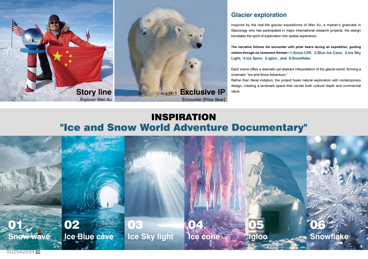 Inspired by a Chinese explorer’s glacier expedition documentary, the project creates six immersive scenes—1.Snow Cliff, 2.Blue Ice Cave, 3.Ice Sky Light, 4.Ice Spire, 5.igloo , and 6.Snowflake—offering a captivating “Ice and Snow Adventure” experience. It combines the spirit of natural exploration with modern design, creating a landmark that blends cultural depth with commercial value.