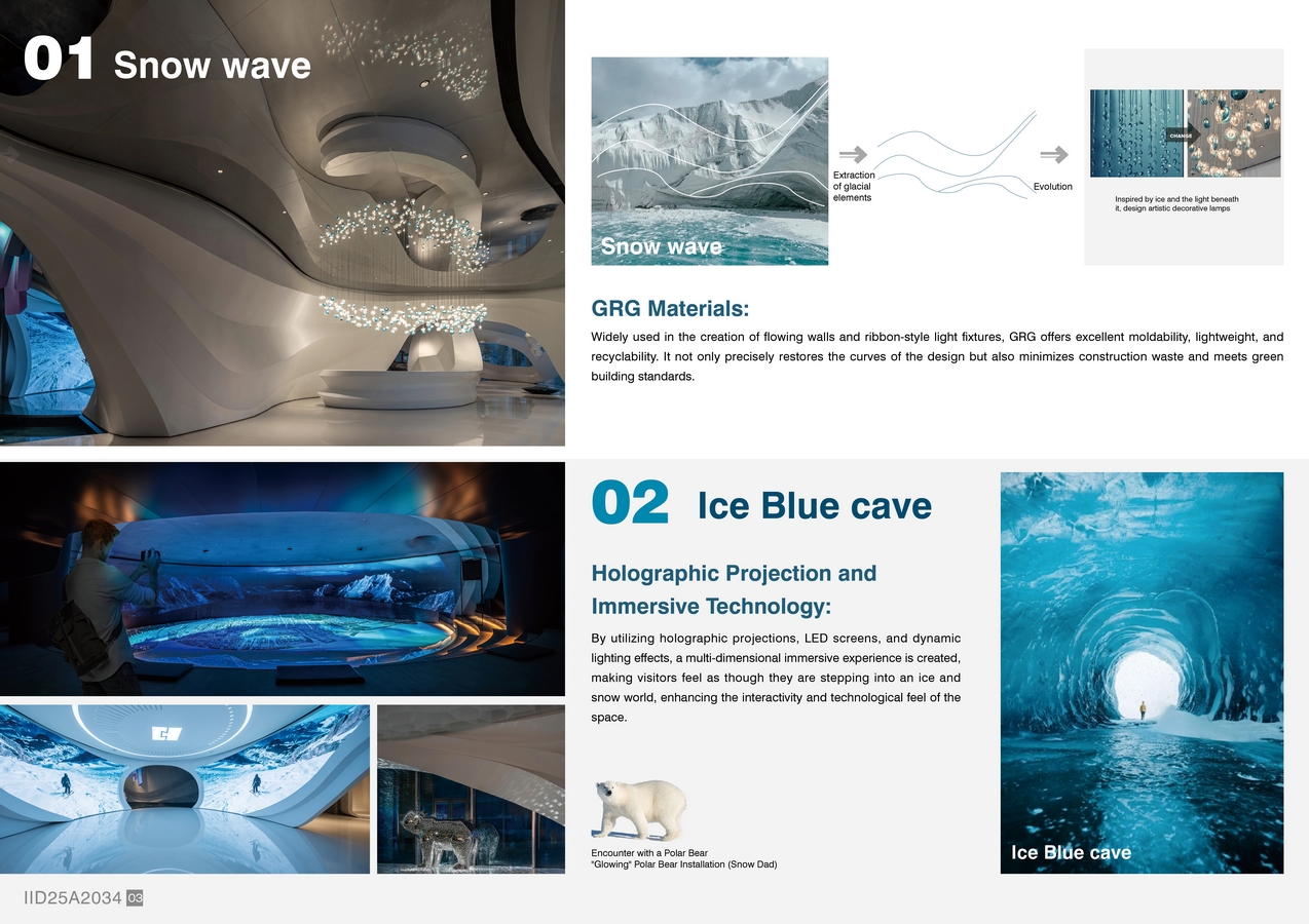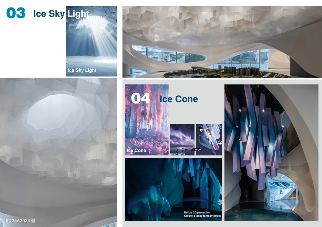 7.THE CREATIVE / RESEARCH CHALLENGE: The main challenge in designing the Hua Fa Ice and Snow World Exhibition Hall was creating a strong visual impact in a limited space with 36 structural columns and irregular ceilings. The design team integrated the columns seamlessly using a streamlined layout and GRG materials, while strategically placing light fixtures to reduce their prominence. Snow textures, light and shadow refraction, and holographic projections were employed to craft a surreal, immersive experience, overcoming spatial constraints and enhancing both artistry and functionality.