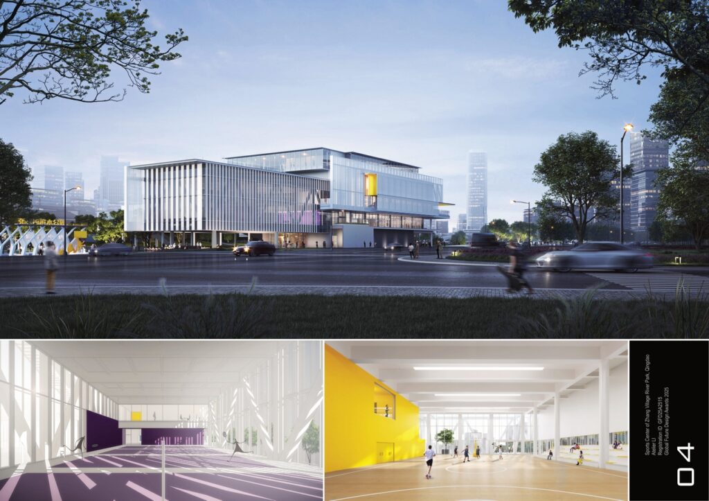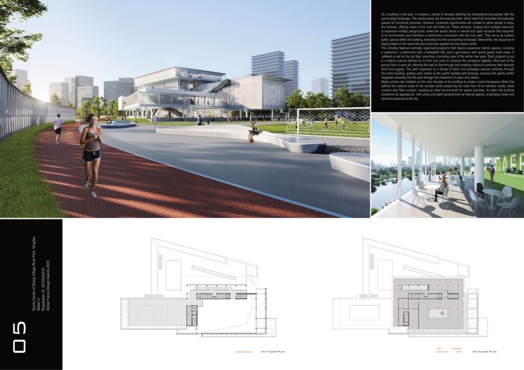Located on the south bank of the Zhang Village River in the city of Qingdao, the sports center is a complex offering a variety of exercise programs. The design emphasizes the transitional role of the sports center, bridging the scale of the park with the urban scale defined by city routes and buildings. Higher volumes are positioned along the urban route, showcasing a 100-meter-long facade, while lower volumes are placed near the riverbank, giving the enormous structure an approachable gesture for park visitors. People can enjoy a relaxing atmosphere around the sports center and engage in activities along the riverside walking path.