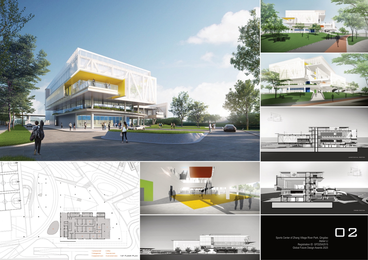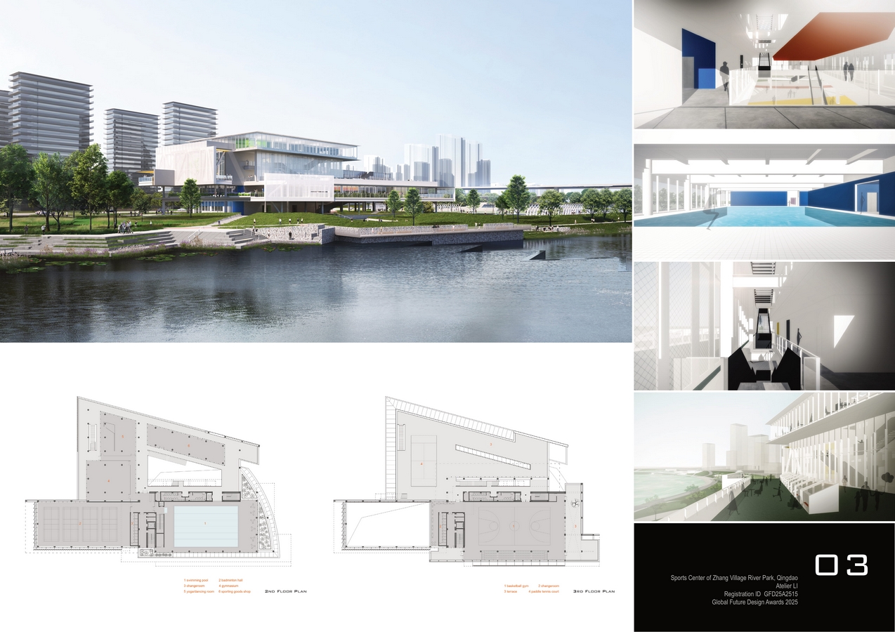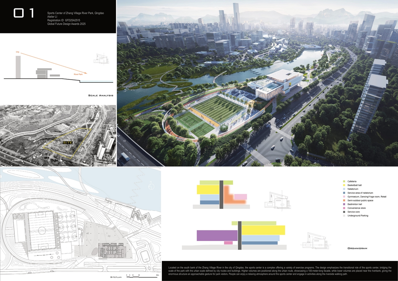 Located on the south bank of the Zhang Village River in the city of Qingdao, the sports center is a complex offering a variety of exercise programs. The design emphasizes the transitional role of the sports center, bridging the scale of the park with the urban scale defined by city routes and buildings. Higher volumes are positioned along the urban route, showcasing a 100-meter-long facade, while lower volumes are placed near the riverbank, giving the enormous structure an approachable gesture for park visitors. People can enjoy a relaxing atmosphere around the sports center and engage in activities along the riverside walking path.