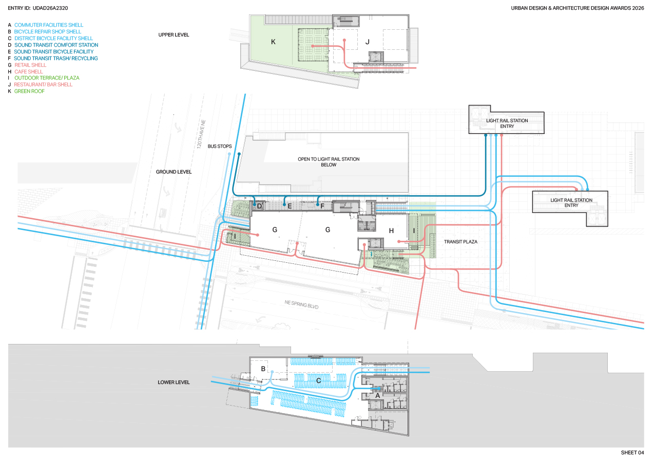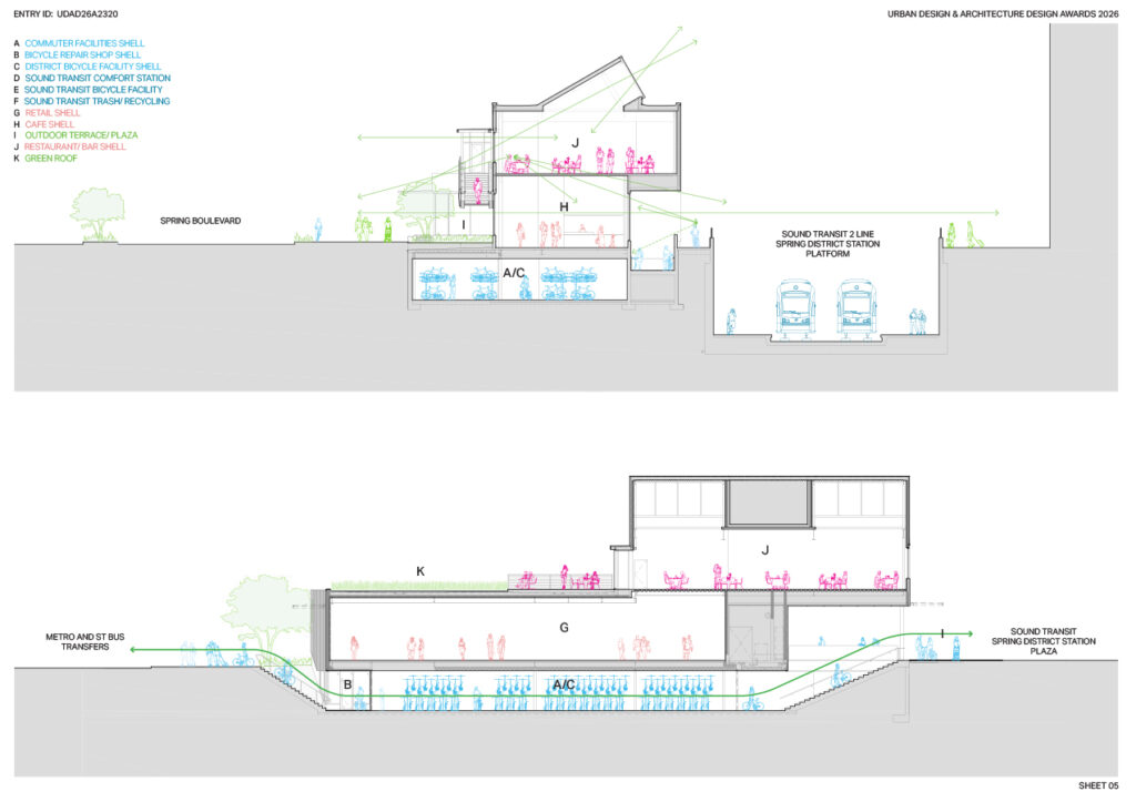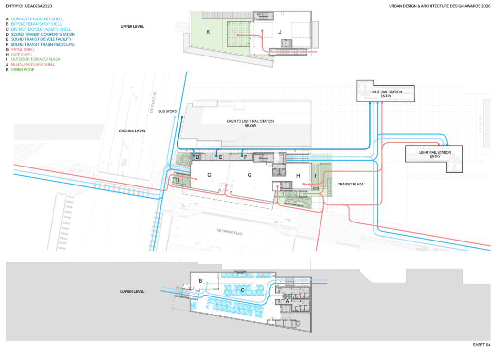 By the time the project entered its early design phases, the program brief was large. It needed to house secure long-term storage for over 450 bikes and e-bikes along with space for a bicycle repair shop; facilities for Sound Transit’s 2-Line light rail drivers, maintenance contractors, and system staff; refuse, compost, and recycling storage for the station itself; secure locker and shower facilities for commuters; and importantly, attractive and enticing spaces for transit-oriented retail, cafes, and restaurants.
