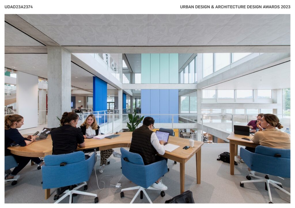 SQUARE is the new learning center of University of St. Gallen in Switzerland. Designed by Sou Fujimoto Architects, the building is based on the concept of unbroken connectivity and multifunctionality and models new ways of learning and interaction between students, lecturers and general public. Architecture studio Evolution Design was commissioned to develop a furniture concept that enables experimental learning and teaching and to fit out the building and several roof terraces.