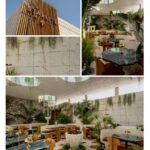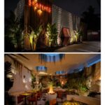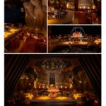 The refreshed space pairs raw, imposing rock walls with rich fabrics and custom furnishings. A sculptural hexagonal, travertine and wood bar anchors the room beneath a chandelier evoking a starry constellation. Warm copper, walnut, and velvet add grounded luxury, while a mirrored ceiling amplifies the cave-like feel. Starlite has been completely transformed into a glamorous version of itself with all new details but the same personality.
