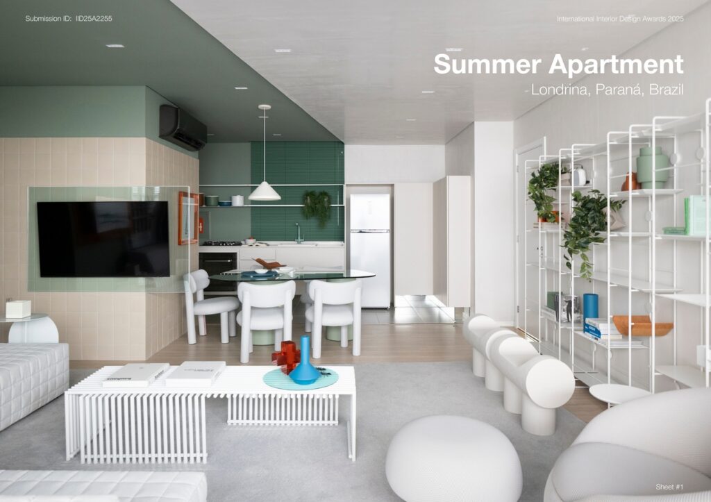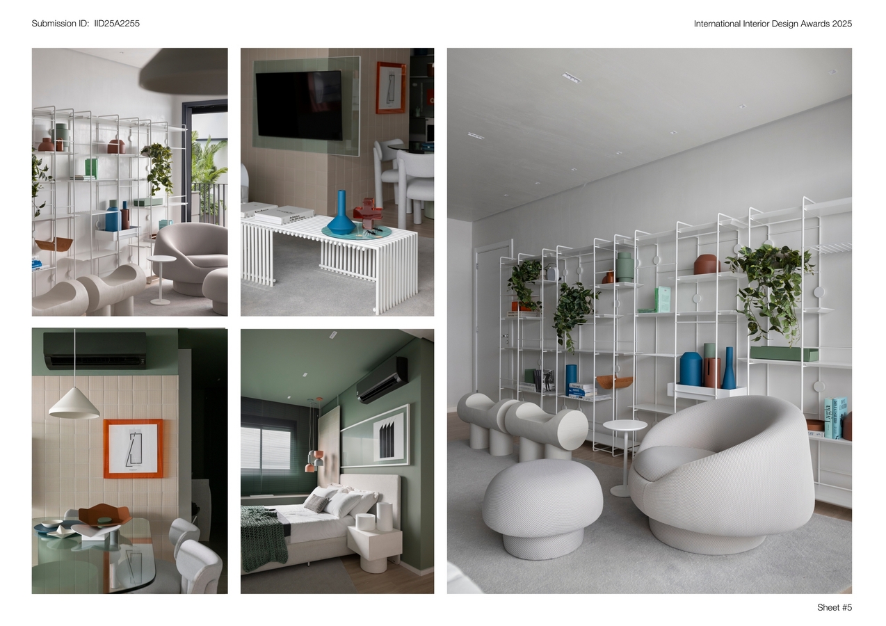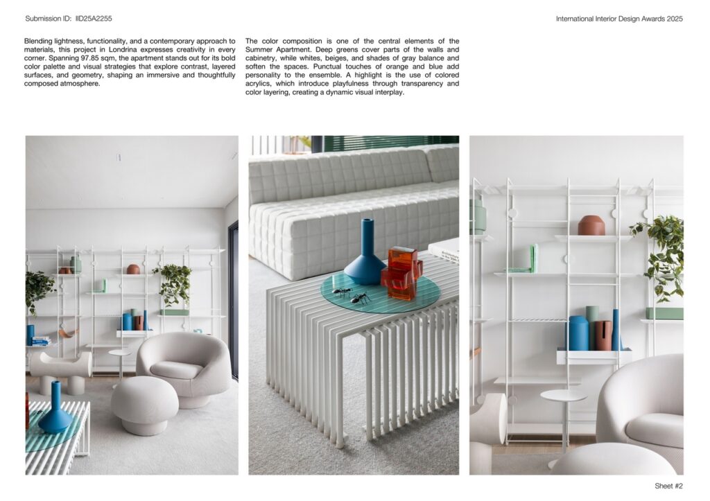 The color composition is one of the central elements of the Summer Apartment. Deep greens cover parts of the walls and cabinetry, while whites, beiges, and shades of gray balance and soften the spaces. Punctual touches of orange and blue add personality to the ensemble. A highlight is the use of colored acrylics, which introduce playfulness through transparency and color layering, creating a dynamic visual interplay.