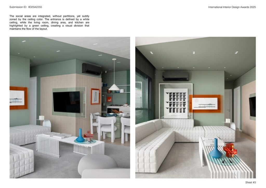 The social areas are integrated, without partitions, yet subtly zoned by the ceiling color. The entrance is defined by a white ceiling, while the living room, dining area, and kitchen are highlighted by a green ceiling, creating a visual division that maintains the flow of the layout. The organic and lightweight furniture forms part of a curated selection of signed pieces that celebrate Brazilian design and reinforce the apartment’s visual identity.