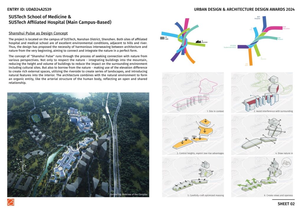 This project consists of an affiliated hospital of 167,600 sqm and a medical school of 164,000 sqm, which will be integrated into a function sharing complex with both educational and medical program. Along with the concept of “Shanshui Pulse”, the shape of buildings that are embedded in the nature echoes with their multiple function needs, exploring the connection between human, nature, and space, as well as creating a harmonious architectural form that blends city and nature.