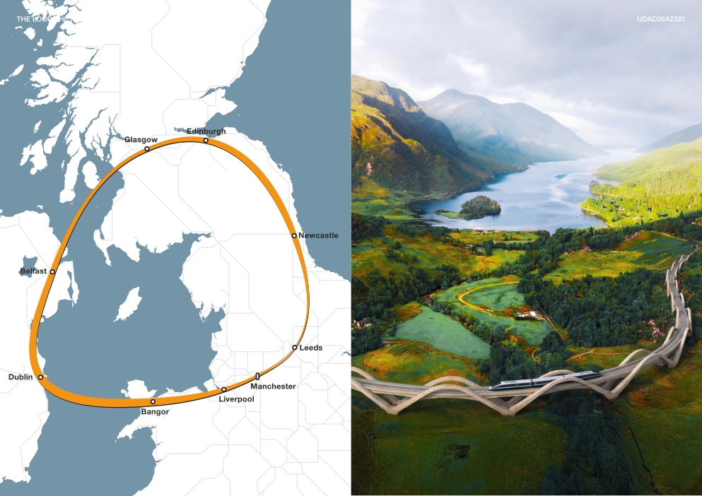 The Loop would link Liverpool, Manchester, Leeds, Newcastle, Edinburgh, Glasgow, Belfast, Dublin and Bangor in a continuous circuit, operating in both directions. Trains of approximately fifty metres in length would run every five minutes at speeds of up to three hundred miles per hour on an elevated viaduct, minimising disruption at ground level. Services would operate on a point to point basis, running directly from origin to destination without intermediate stops. A Liverpool to Glasgow service, for example, would not stop elsewhere, nor would a Belfast to Manchester service. Trains serving other destinations would pass through stations while passengers are boarding and alighting.
