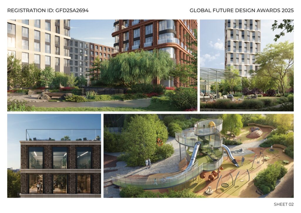 The promenade leads to an active recreation area — a multifunctional sports ground which features zones for football, volleyball, basketball, and a workout area. For younger residents, there are children’s play spaces, a dry fountain for games on hot days, a cascading pond, and a stream.