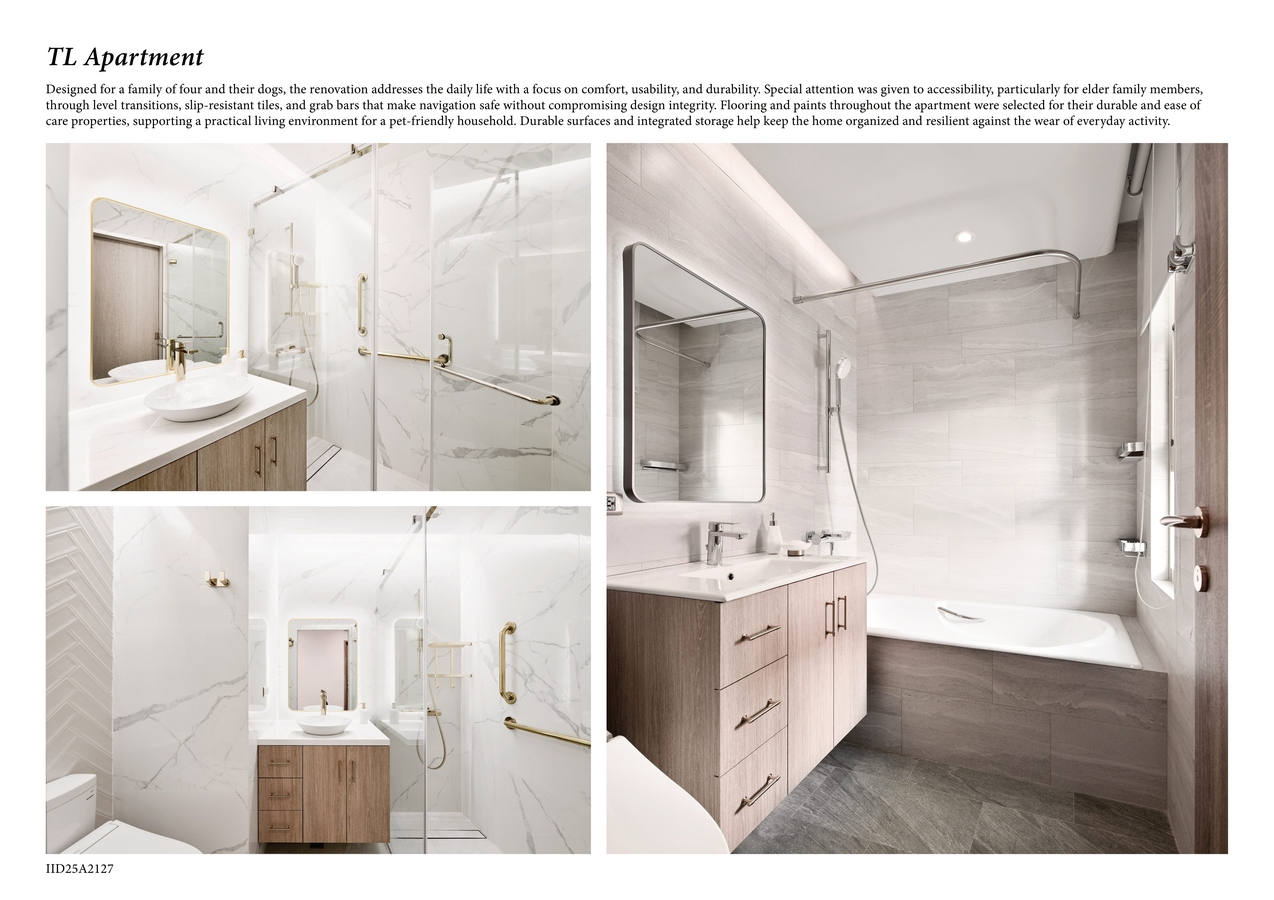 Designed for a family of four and their dogs, the renovation addresses the daily life with a focus on comfort, usability, and durability. Special attention was given to accessibility, particularly for elder family members, through level transitions, slip-resistant tiles, and grab bars that make navigation safe without compromising design integrity. Flooring and paints throughout the apartment were selected for their durable and ease of care properties, supporting a practical living environment for a pet-friendly household. Durable surfaces and integrated storage help keep the home organized and resilient against the wear of everyday activity.