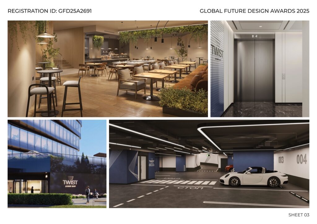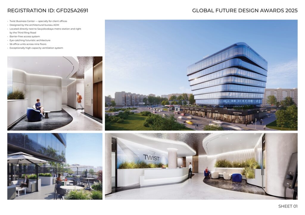 Located at the major crossroads, Twist is visible from all directions – its eye-catching architecture stands out from afar. The building’s unique “twisted” shape and panoramic molded windows give the facade a futuristic appearance. The interior design is in harmony with the architectural concept: a futuristic lobby with reception and waiting area, office floors, parking, staircases, and restrooms — all executed in a single style.