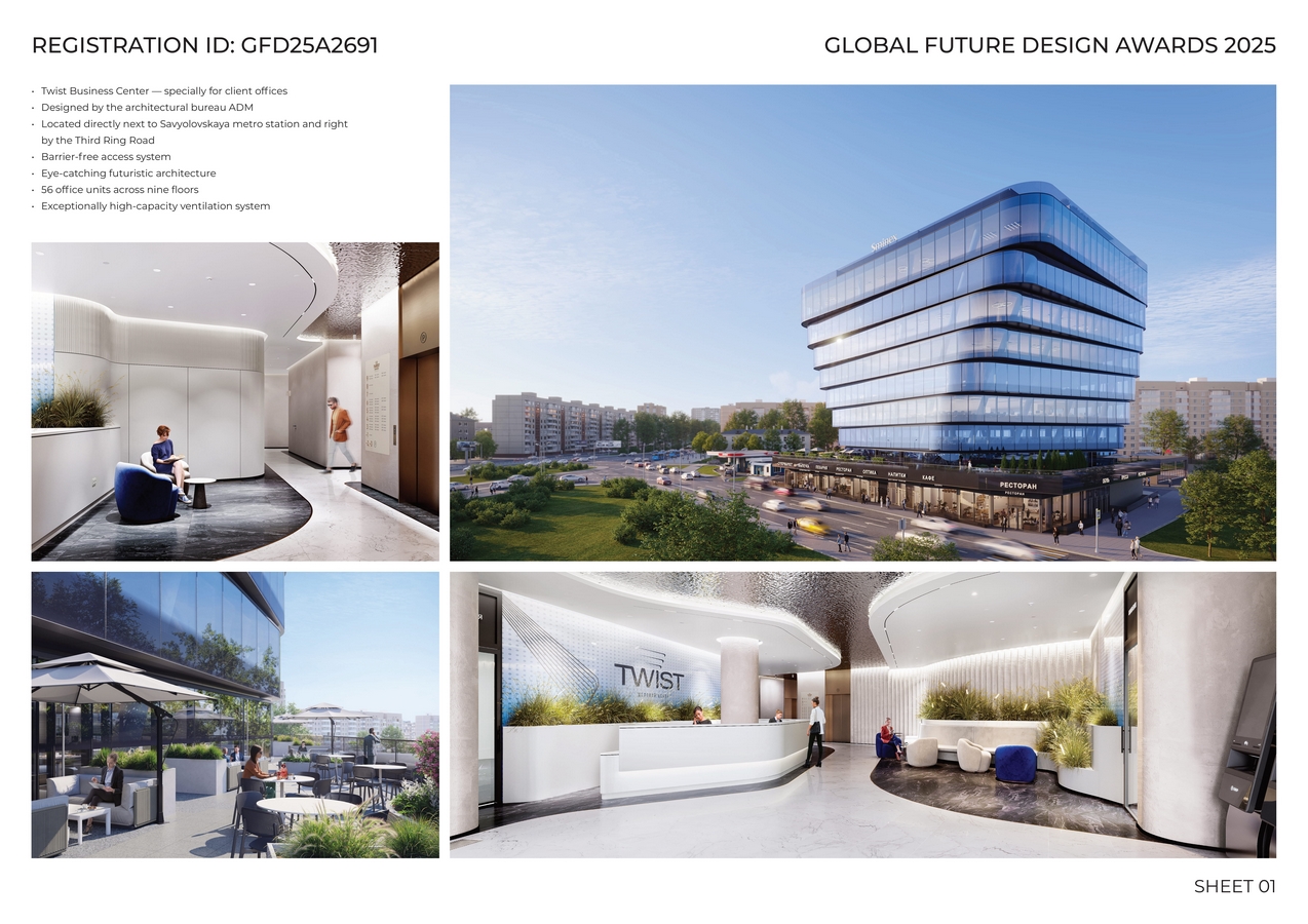 Located at the major crossroads, Twist is visible from all directions – its eye-catching architecture stands out from afar. The building’s unique “twisted” shape and panoramic molded windows give the facade a futuristic appearance. The interior design is in harmony with the architectural concept: a futuristic lobby with reception and waiting area, office floors, parking, staircases, and restrooms — all executed in a single style.
