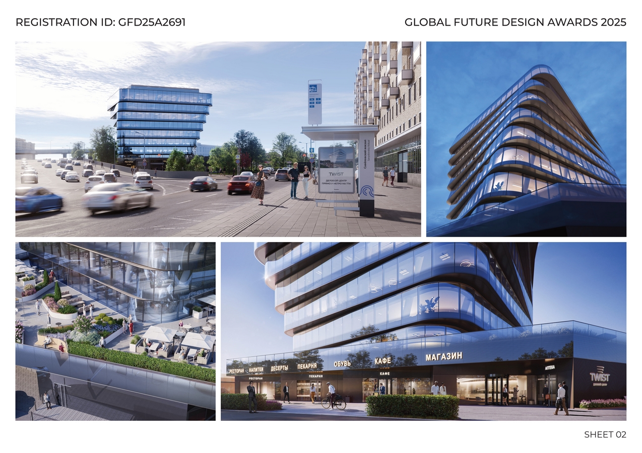 Twist offers a well-developed infrastructure for informal interactions with clients: four restaurants with terraces, a coffee shop, and landscaped terraces on the roof and stylobate for employees and visitors.