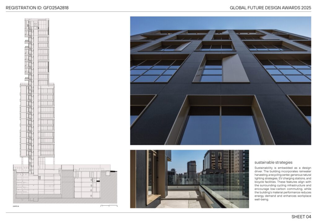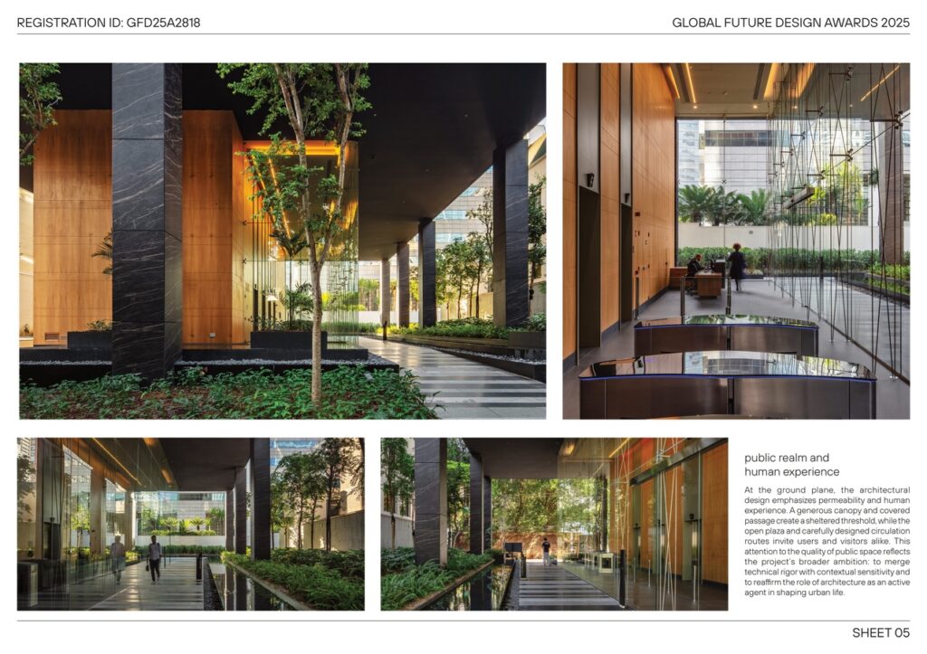At the ground plane, the architectural design emphasizes permeability and human experience. A generous canopy and covered passage create a sheltered threshold, while the open plaza and carefully designed circulation routes invite users and visitors alike. This attention to the quality of public space reflects the project’s broader ambition: to merge technical rigor with contextual sensitivity and to reaffirm the role of architecture as an active agent in shaping urban life.