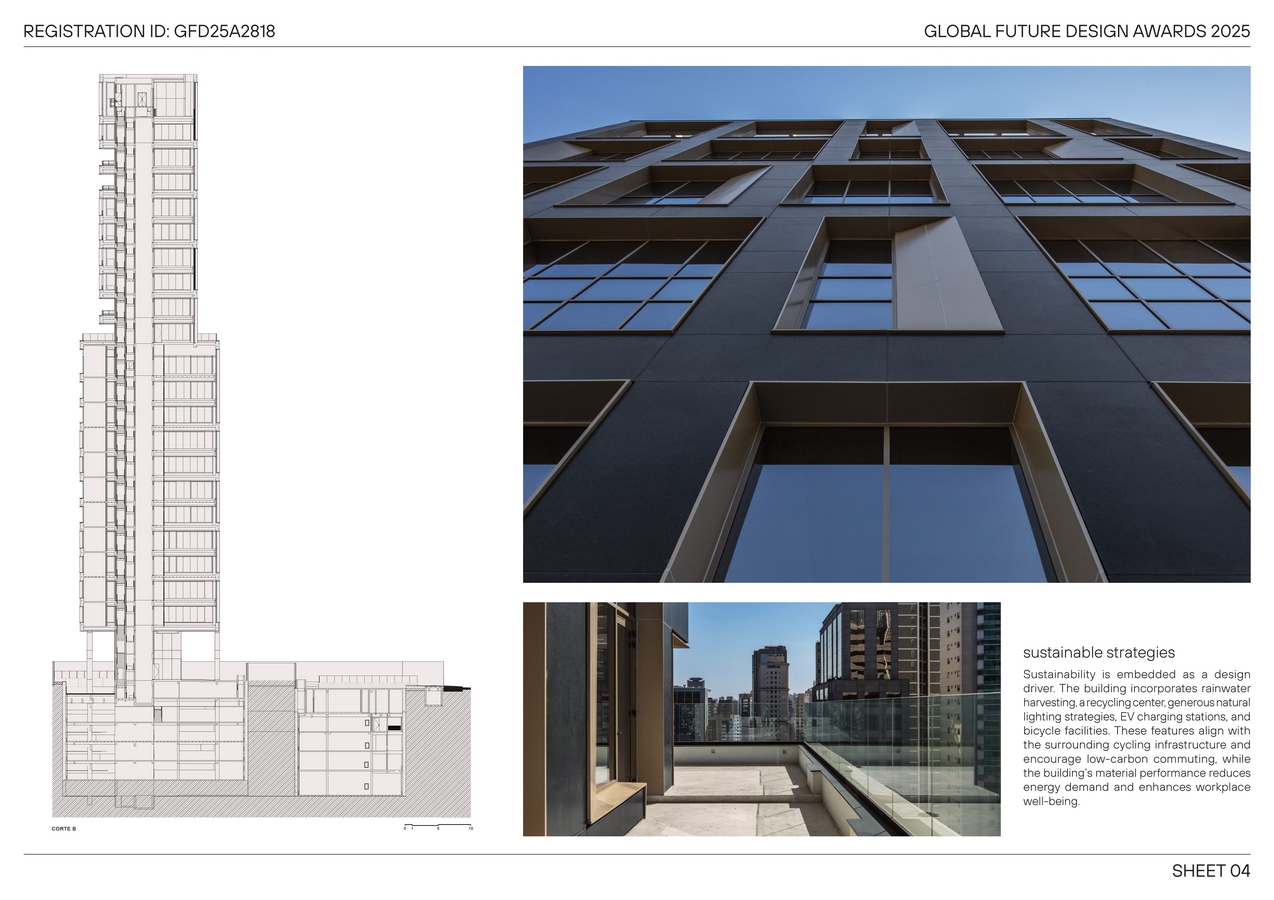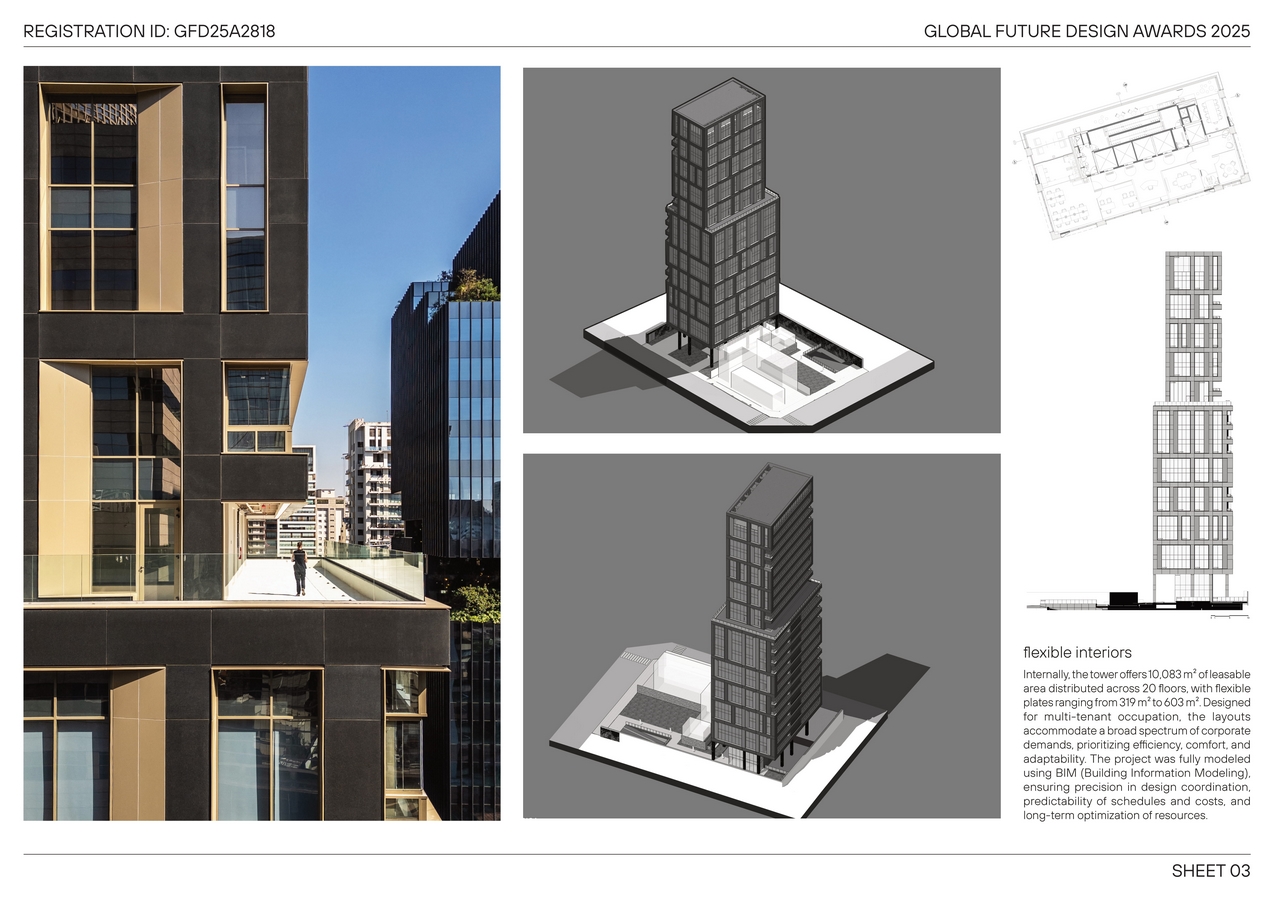 Internally, the tower offers 10,083 m² of leasable area distributed across 20 floors, with flexible plates ranging from 319 m² to 603 m². Designed for multi-tenant occupation, the layouts accommodate a broad spectrum of corporate demands, prioritizing efficiency, comfort, and adaptability. The project was fully modeled using BIM (Building Information Modeling), ensuring precision in design coordination, predictability of schedules and costs, and long-term optimization of resources.
