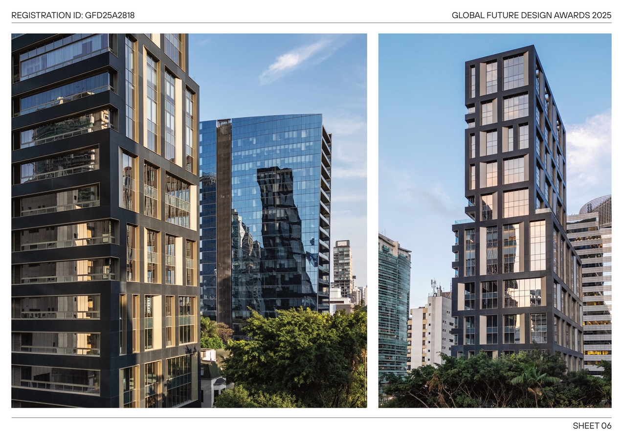 The site extends across two fronts, facing AtĂlio Inocenti Street and connecting through a landscaped plaza to Leopoldo Couto de MagalhĂŁes Street. This dual access enables a fluid integration with the neighborhood and positions the tower as an elegant urban belvedere. Elevated on 10-meter-high pilotis, the building enhances porosity at ground level, inviting pedestrians into its open square and fostering permeability between city and architecture.