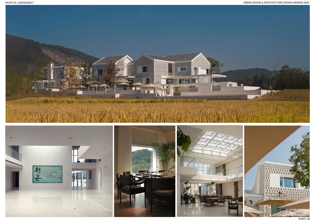 Inspired by the collective banquets tradition in rural China, the architecture formal strategy is adopting a settlement form of small buildings surrounding the atrium. Arrange relatively concentrated dining areas in the atrium to create a unique rural atmosphere of collective enjoyment of delicious food. Each small building volume extends slightly outward to ensure a better landscape view for private boxes. In the area near the rice fields on the southwest side, utilizing the height difference between the building and farmland, scattered outdoor dining areas are arranged to form a close relationship between foods and crops.