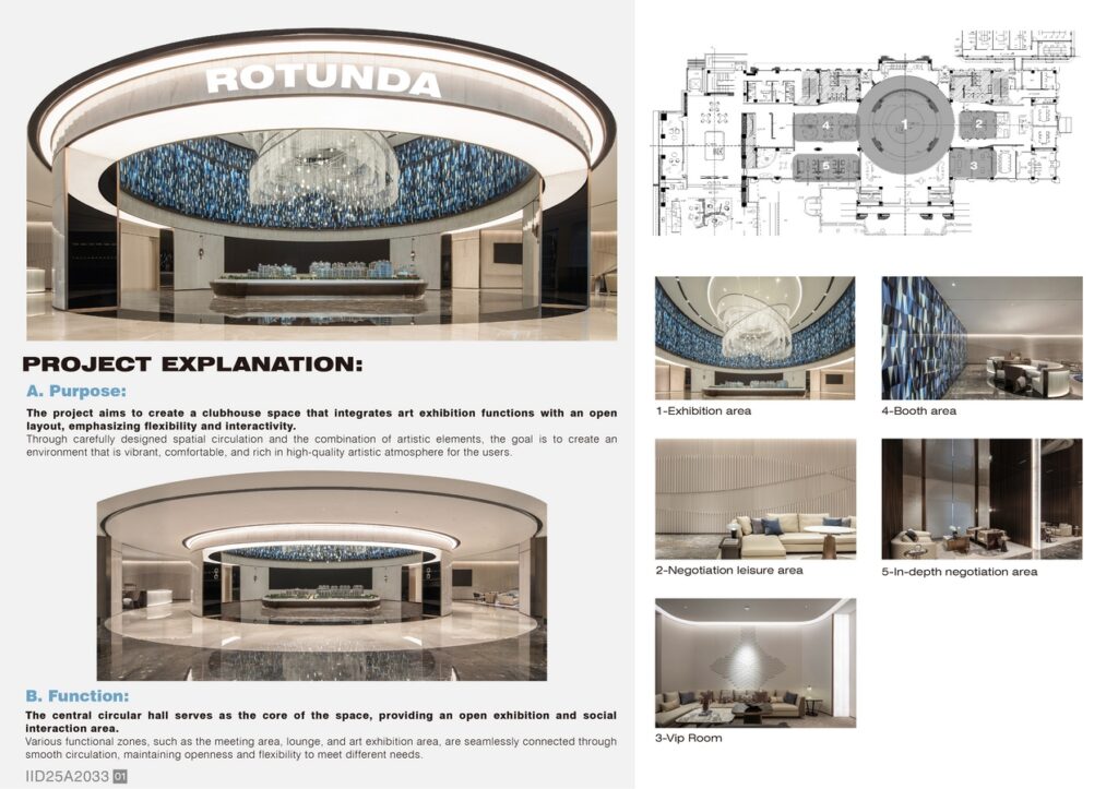 The central circular hall serves as the core of the space, providing an open exhibition and social interaction area. Various functional zones, such as the meeting area, lounge, and art exhibition area, are seamlessly connected through smooth circulation, maintaining openness and flexibility to meet different needs.