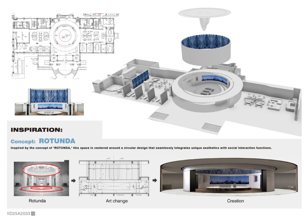 Inspired by the concept of “ROTUNDA,” this space is centered around a circular design that seamlessly integrates unique aesthetics with social interaction functions. Through a deep consideration of fluid spatial layout, it breaks the boundaries of traditional sales center design. The circular hall naturally connects the functional areas, fostering communication and interaction. It serves not only as a visual focal point but also symbolizes harmony and completeness. The clever design ensures the space meets everyday needs while offering an art exhibition function, balancing practicality with an artistic atmosphere to present a rich spatial experience.