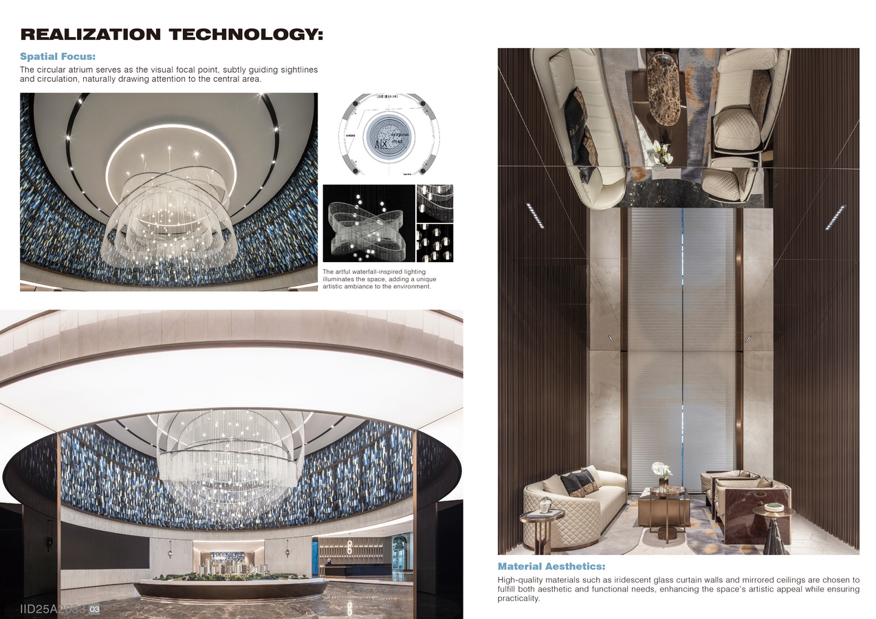 Spatial Focus: The circular atrium serves as the visual focal point, subtly guiding sightlines and circulation, naturally drawing attention to the central area. The artful waterfall-inspired lighting illuminates the space, adding a unique artistic ambiance to the environment.