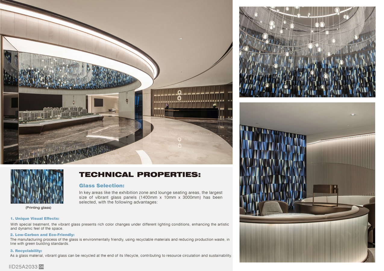 Material Aesthetics: High-quality materials such as iridescent glass curtain walls and mirrored ceilings are chosen to fulfill both aesthetic and functional needs, enhancing the space’s artistic appeal while ensuring practicality.