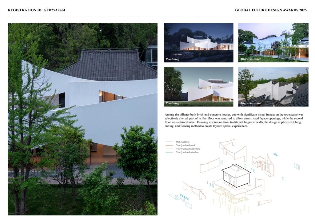 The design concept follows two key steps: first, preservation as the foundation for transformation. The spatial layout of the village and the architectural DNA of Gan-style dwellings—including grey brick walls, black-tiled horse-head gables, central courtyards, and “Tianyan” drainage systems—were carefully studied and fully preserved. Second, innovation as the breakthrough. Among the villager-built brick-and-concrete houses, one with significant visual impact on the village’s appearance was selectively altered: part of its first floor was removed to allow unrestricted façade openings, while the second floor was retained intact. Drawing inspiration from traditional fragment walls, the design applied stretching, cutting, and flowing techniques to create layered spatial experiences. Carefully positioned openings bring greenery from the rear courtyard into the interior, using the traditional Chinese garden technique of borrowed scenery to achieve harmonious coexistence between architecture and nature. This approach treats walls as scrolls, shadows as ink, and light as brushwork—expressing a design philosophy where old and new converge.