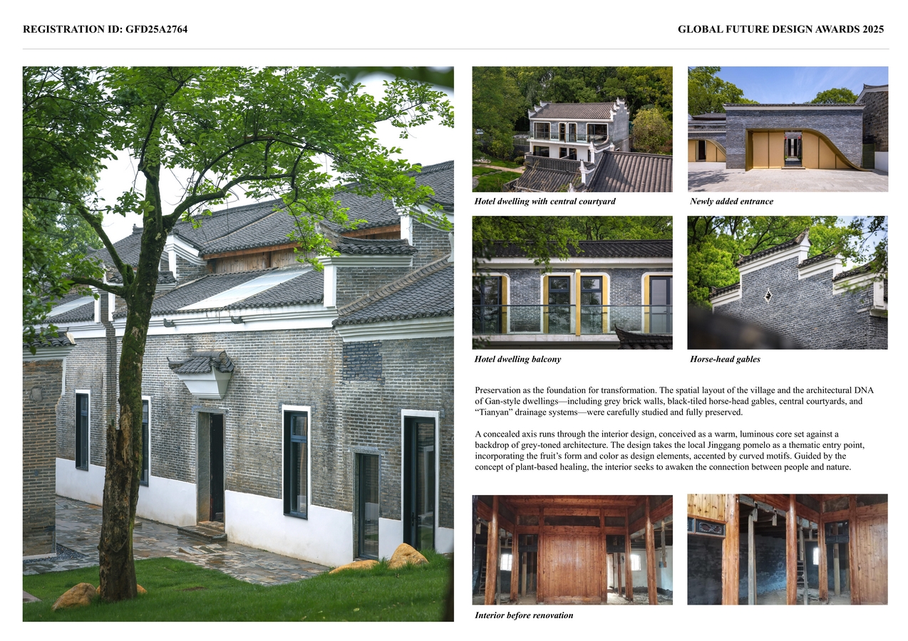 ZEN X Hotel is located directly opposite the Ouyang Clan’s ancestral hall, on the north side of the “Seven Stars Accompanying the Moon” pond. The site comprises 12 small-to-medium-sized dwellings: seven are traditional brick-and-timber vernacular houses, while the remaining five are two-story brick-and-concrete buildings constructed by villagers after demolishing their old homes, scattered irregularly throughout the plot.