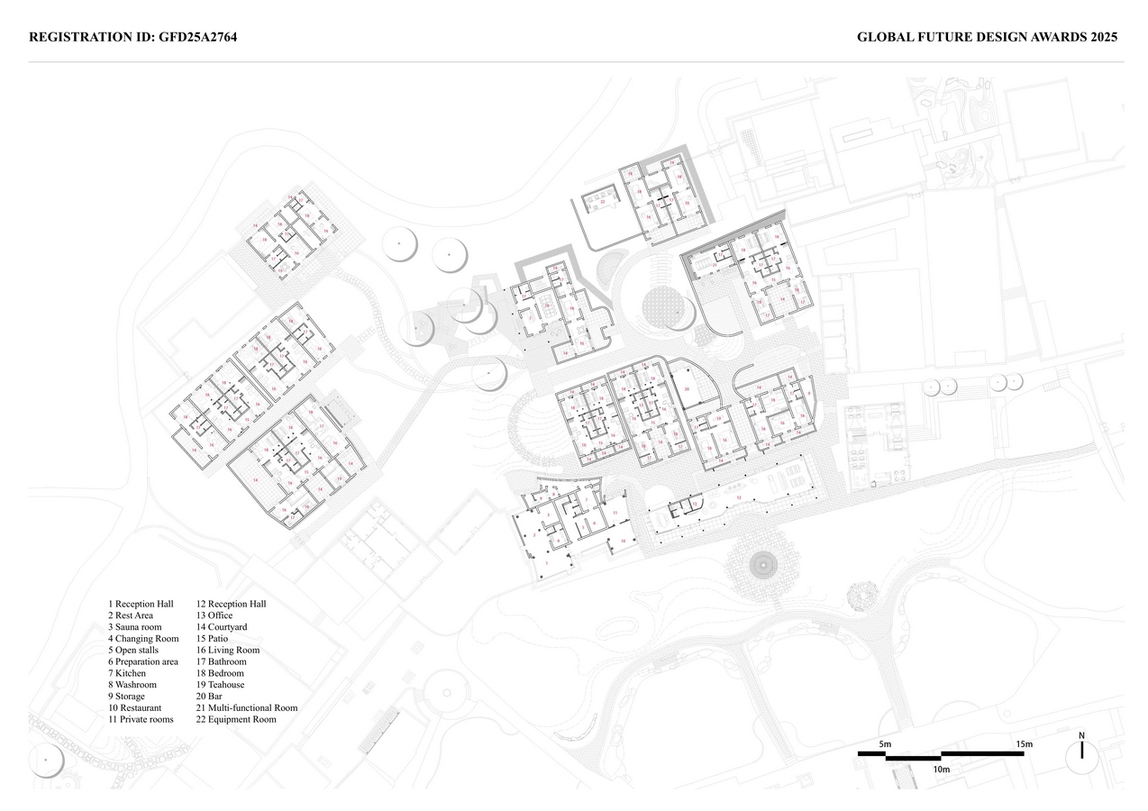 A concealed axis runs through the interior design, conceived as a warm, luminous core set against a backdrop of grey-toned architecture. To achieve this, the interior spaces of the original buildings were reorganized. The design takes the local Jinggang pomelo as a thematic entry point, incorporating the fruit’s form and color as design elements, accented by curved motifs. Guided by the concept of plant-based healing, the interior seeks to awaken the connection between people and nature.