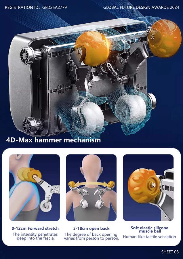 The thermal sensing movement combined with the 45° sauna-style sliding massage function integrates heating and sliding massage, bringing deep relaxation and rehabilitation experience to the body.