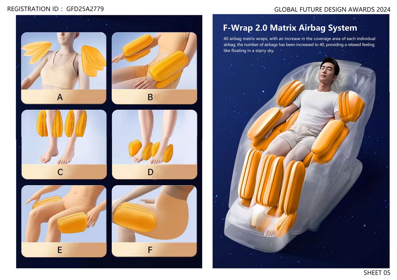 Over 40 airbags are distributed throughout the body and limbs, forming a full-coverage matrix wrap, integrating professional techniques such as kneading, hammering, tuina, patting, and acupressure, covering over 30 massage modes to meet the personalized needs of users.