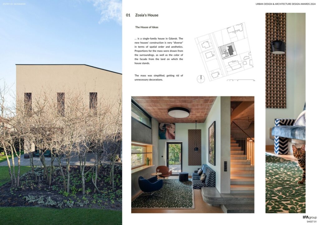 … is a single-family house in Gdansk. The new houses’ construction is very “diverse” in terms of spatial order and aesthetics. Proportions for the mass were drawn from the surroundings, as well as the color of the facade from the land on which the house stands. The mass was simplified, getting rid of unnecessary decorations.
