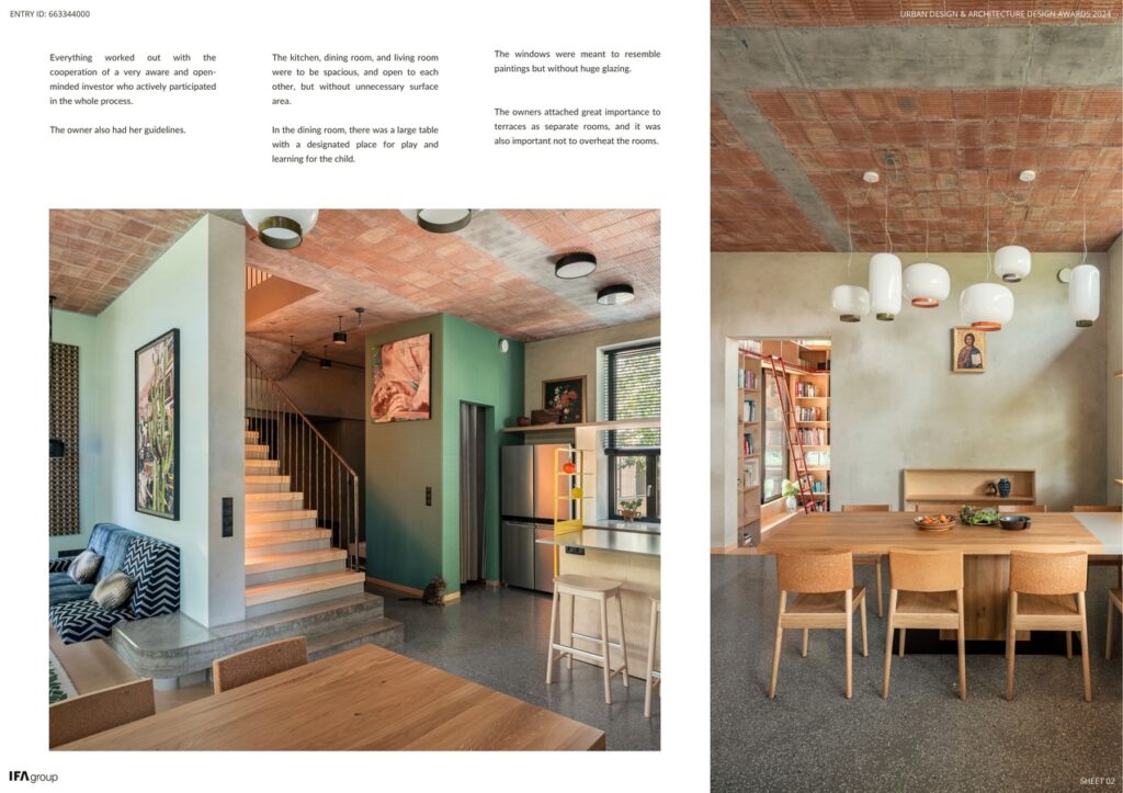 Everything worked out with the cooperation of a very aware and open-minded investor who actively participated in the whole process. The owner also had her guidelines. The kitchen, dining room, and living room were to be spacious, and open to each other, but without unnecessary surface area. In the dining room, there was a large table with a designated place for play and learning for the child. The windows were meant to resemble paintings but without huge glazing. The owners attached great importance to terraces as separate rooms, and it was also important not to overheat the rooms.