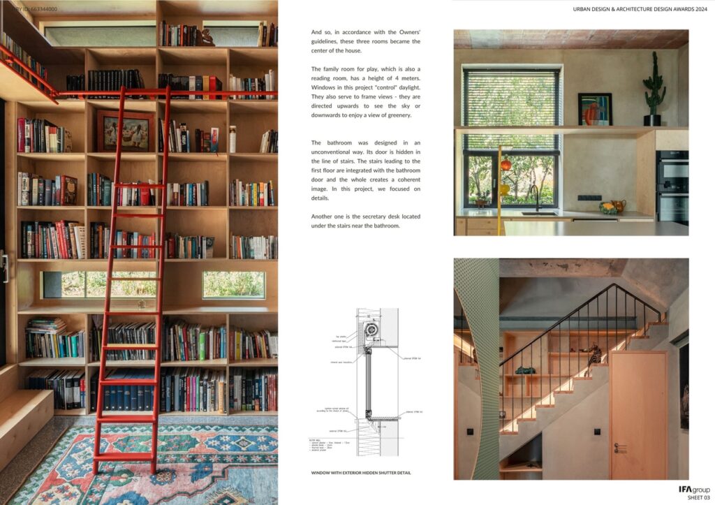 And so, in accordance with the Owners’ guidelines, these three rooms became the center of the house. The family room for play, which is also a reading room, has a height of 4 meters. Windows in this project “control” daylight. They also serve to frame views – they are directed upwards to see the sky or downwards to enjoy a view of greenery.