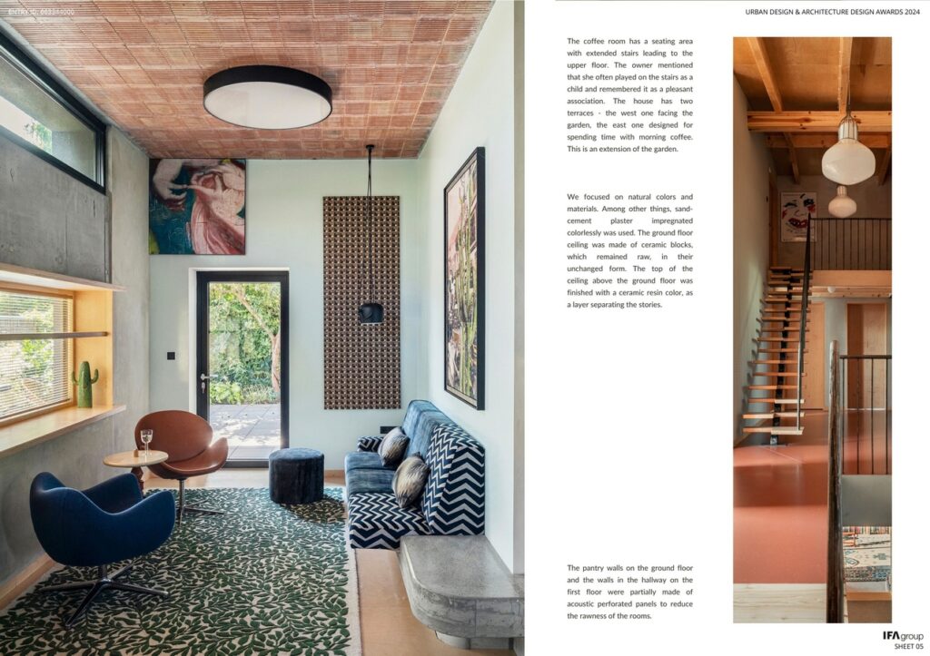 We focused on natural colors and materials. Among other things, sand-cement plaster impregnated colorlessly was used. The ground floor ceiling was made of ceramic blocks, which remained raw, in their unchanged form. The top of the ceiling above the ground floor was finished with a ceramic resin color, as a layer separating the stories.