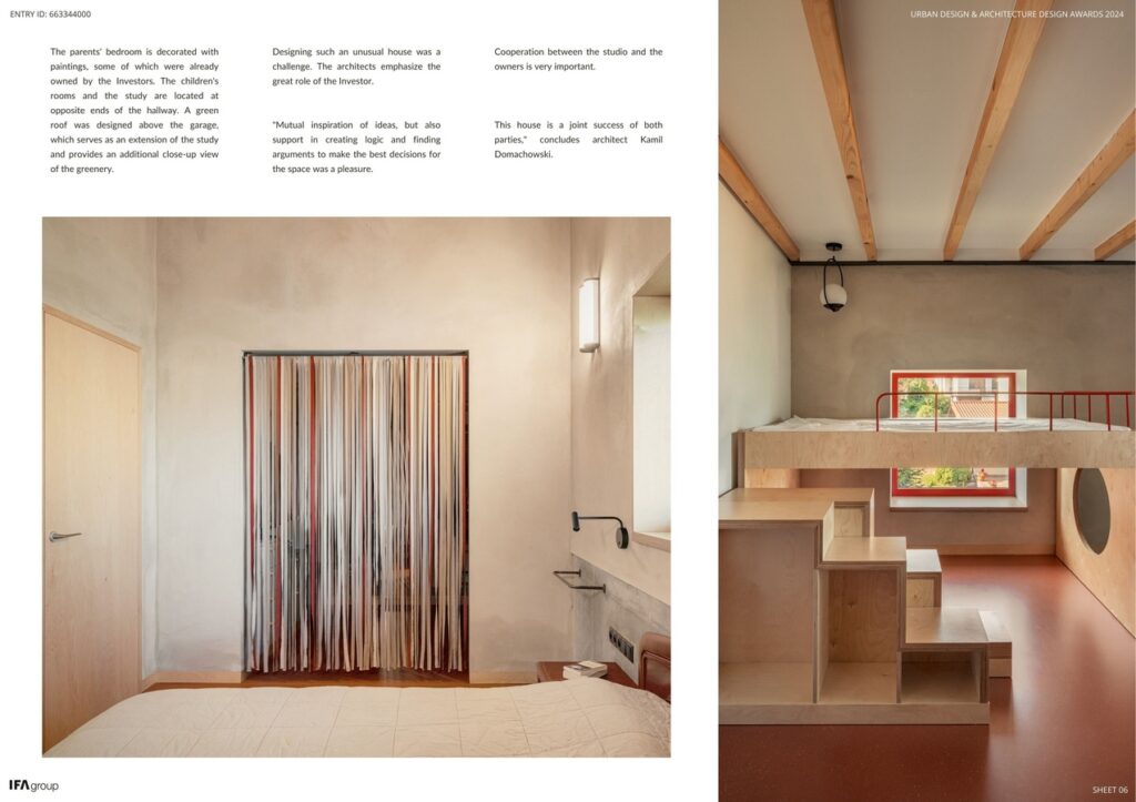 The parents’ bedroom is decorated with paintings, some of which were already owned by the Investors. The children’s rooms and the study are located at opposite ends of the hallway. A green roof was designed above the garage, which serves as an extension of the study and provides an additional close-up view of the greenery.