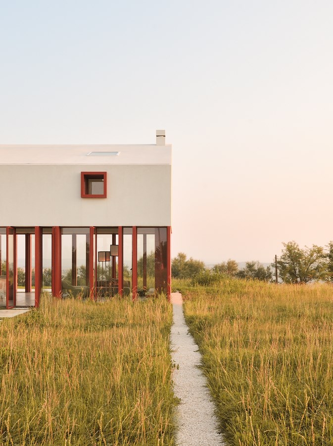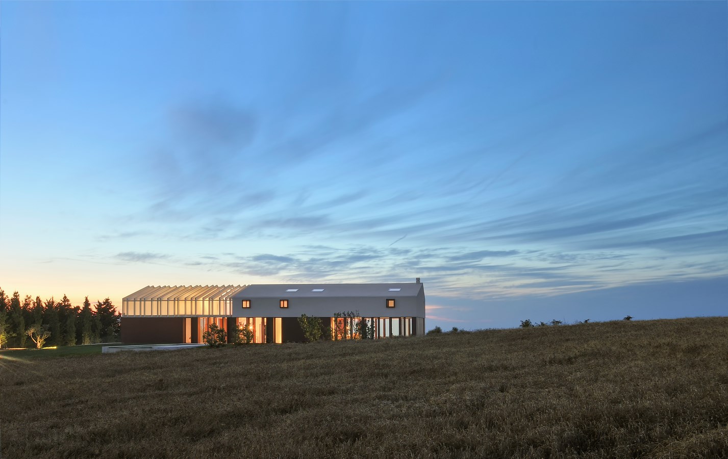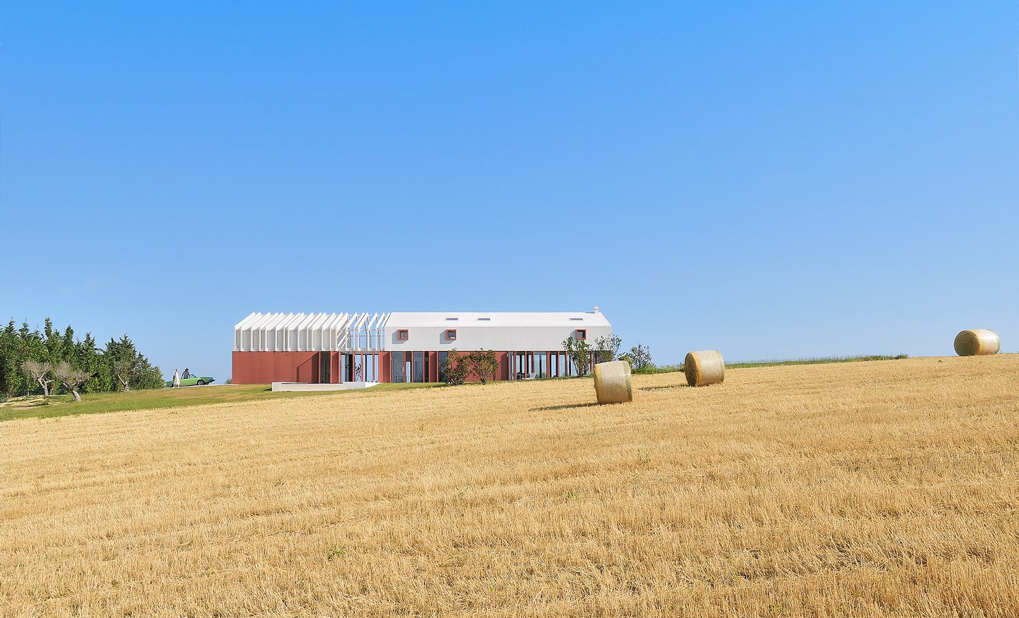 The house is located on the outskirts of the urban space, where fields grow; the permeability of the soil is left to its maximum, with the grass that touches the perimeter of the house and with the minimum surface of outdoor paving that is detached, isolated from the house. There is no fence to demarcates the private property. A swathe of grass surrounds ideally the house in the field (cultivated in rotation with grain, barley, sunflower) expanding it. The attempt is to break the border, without following the protocol for which the private housing space is split up from farm work.