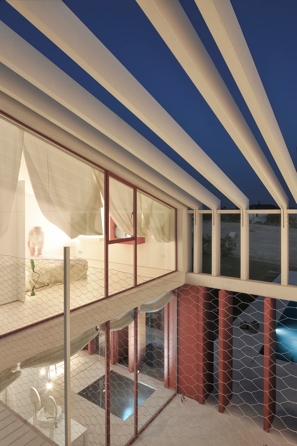 The body of the building can be crossed in more than one position: the patio entrance, the living and bathroom/ spa. In the closed block of the first floor, an unusual window, with kaleidoscopic viewfinders head towards the landscape, giving the possibility to look out at the two counterposed slopes from the same position. The relation with the exterior changes by moving close to them, allowing the entrance of the amplified surrounding panorama. The emptiness that springs in the dialectical scheme internal-external of the project, bounded by walls (from the open space of the patio and the outside catwalk, to the more intimate area of the bedrooms, arriving to the area filtered from curtains on the first floor) is important to break up what unusually tends to occupy in a stable and immobilizing way.