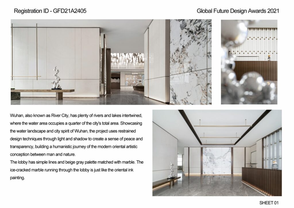 Wuhan, also known as River City, has plenty of rivers and lakes intertwined, where the water area occupies a quarter of the city’s total area. Showcasing the water landscape and city spirit of Wuhan, the project uses restrained design techniques through light and shadow to create a sense of peace and transparency, building a humanistic journey of the modern oriental artistic conception between man and nature.
