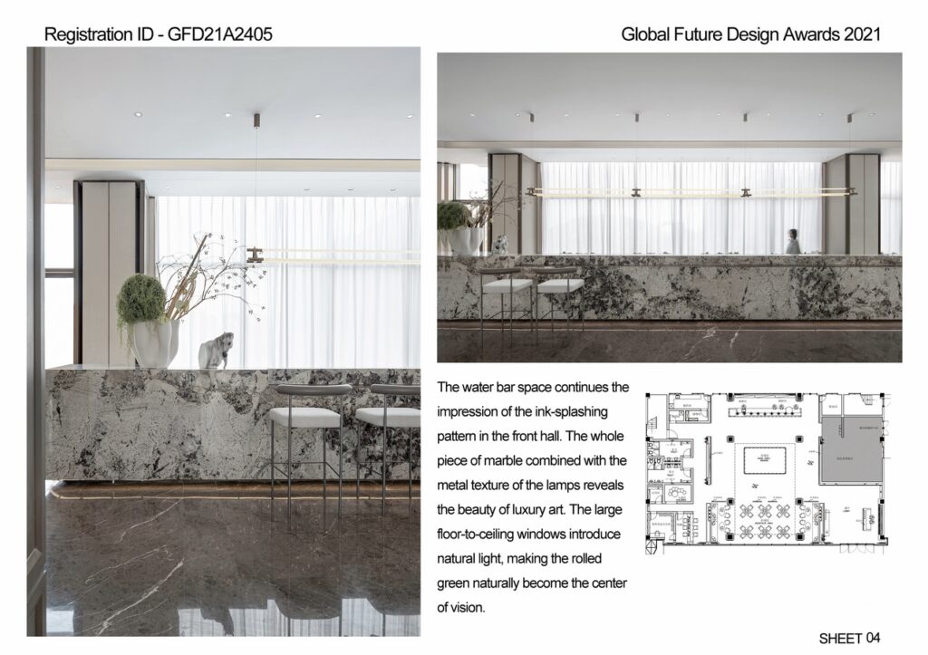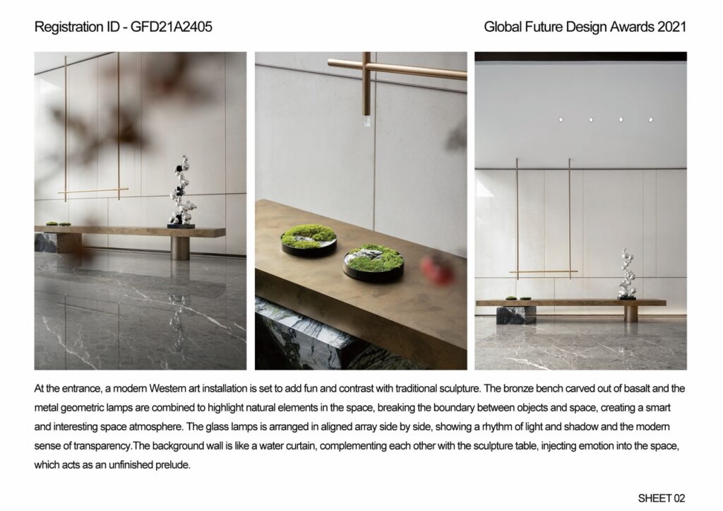 The lobby has simple lines and beige gray palette matched with marble. The ice-cracked marble running through the lobby is just like the oriental ink painting. At the entrance, a modern Western art installation is set to add fun and contrast with traditional sculpture. The bronze bench carved out of basalt and the metal geometric lamps are combined to highlight natural elements in the space, breaking the boundary between objects and space, creating a smart and interesting space atmosphere. The glass lamps is arranged in aligned array side by side, showing a rhythm of light and shadow and the modern sense of transparency.The background wall is like a water curtain, complementing each other with the sculpture table, injecting emotion into the space, which acts as an unfinished prelude.